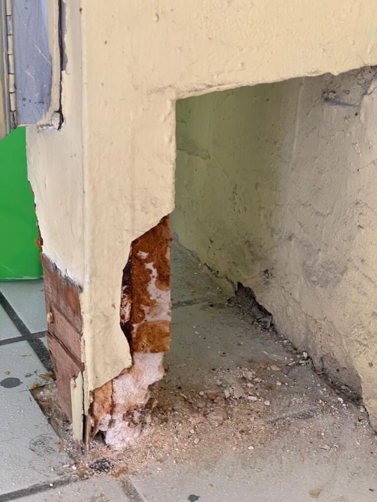 El área de juegos infantiles carecía de medidas de seguridad, había fisuras en el pavimento del patio exterior, el mobiliario estaba en mal estado, un columpio utilizado por los menores estaba en riesgo de colapso, lo mismo que un tinaco propenso a caer justo en esta zona.