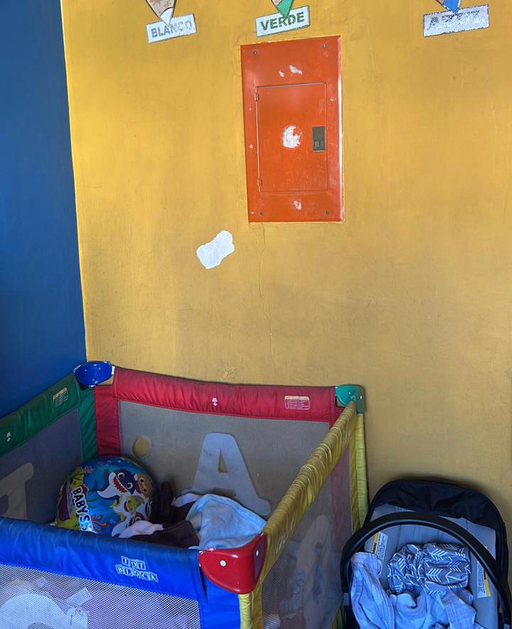 Uno de los salones no tenía extintores, detectores de humo, rutas de evacuación ni protectores en la toma de corriente; en el segundo salón había un centro de carga de alto voltaje justo arriba de una cuna tipo corral, con un menor dormitando al momento de la inspección, y cielos y muros en malas condiciones.