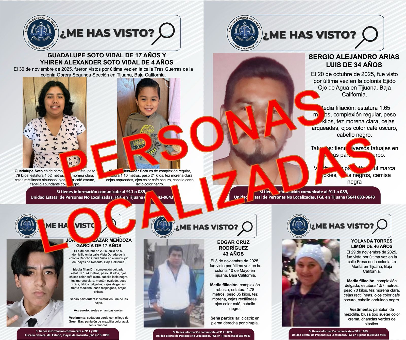 - Agentes estatales de investigación localizaron a seis personas que habían sido reportadas como desaparecidas tanto en Tijuana como en Playas de Rosarito.
