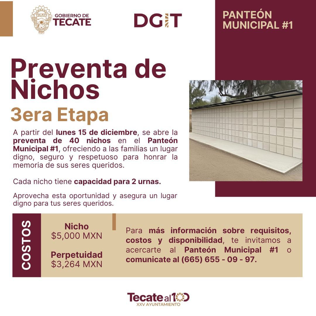 - El Gobierno de Tecate informa a la ciudadanía que, a partir de este lunes 15 de diciembre, se encuentra abierta la preventa de la tercera etapa de nichos en el Panteón Municipal #1, con un total de 40 espacios disponibles, como parte del compromiso por brindar a las familias tecatenses alternativas dignas, seguras y respetuosas para honrar la memoria de sus seres queridos.