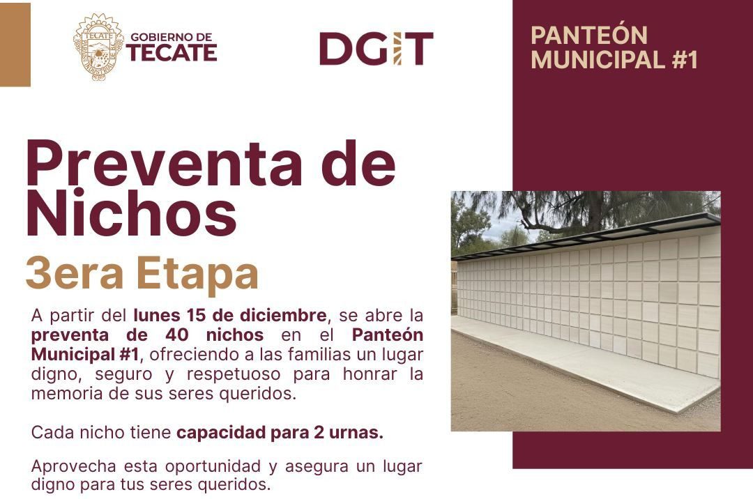 - El Gobierno de Tecate informa a la ciudadanía que, a partir de este lunes 15 de diciembre, se encuentra abierta la preventa de la tercera etapa de nichos en el Panteón Municipal #1, con un total de 40 espacios disponibles, como parte del compromiso por brindar a las familias tecatenses alternativas dignas, seguras y respetuosas para honrar la memoria de sus seres queridos.