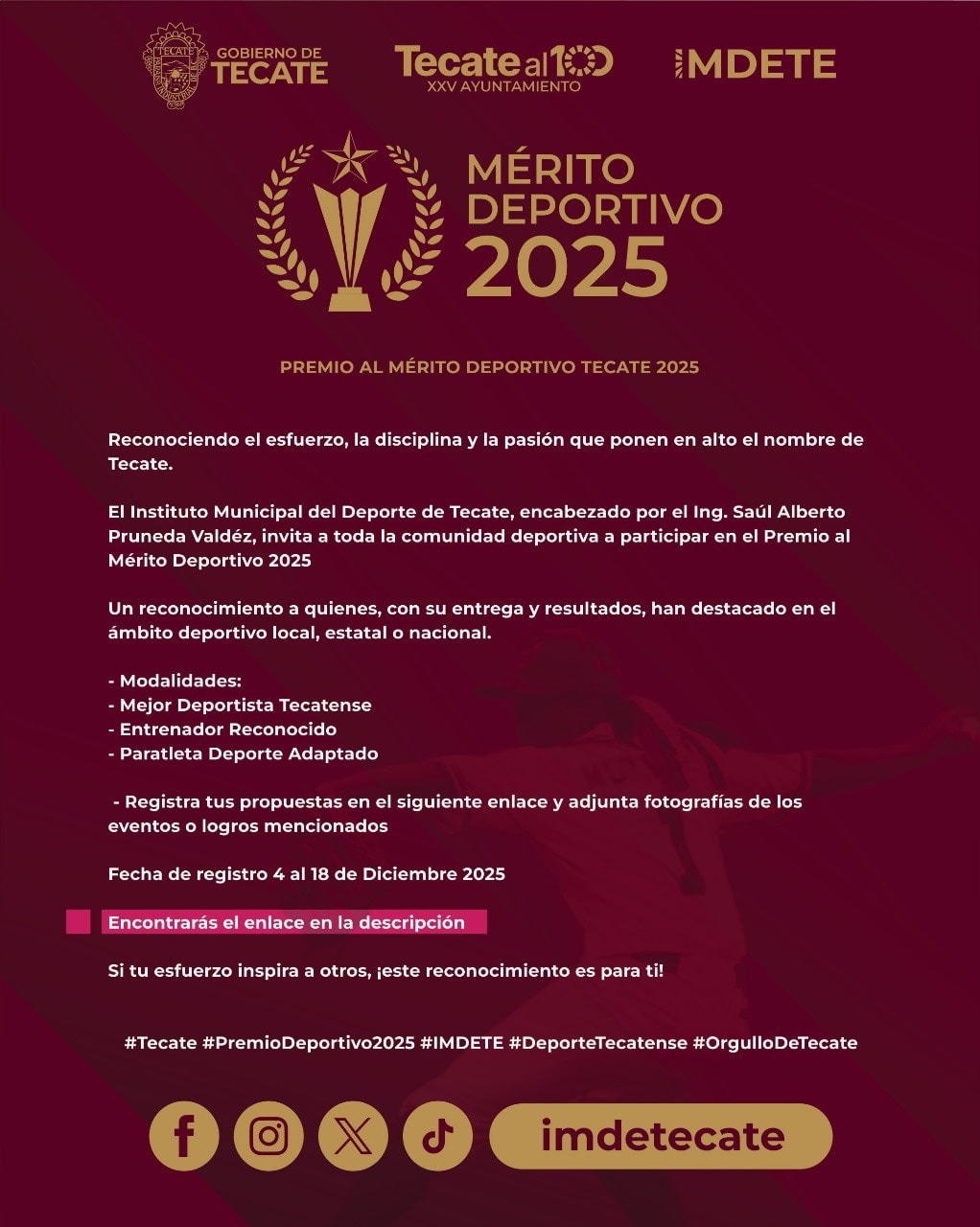 - El Gobierno de Tecate, a través del Instituto Municipal del Deporte (IMDETE), abre la convocatoria “Mérito Deportivo 2025”, para reconocer a quienes, con dedicación y constancia, han dejado huella en el ámbito deportivo a lo largo del último año.