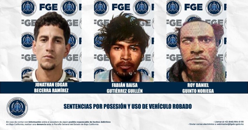 La Fiscalía General del Estado, a través de la Unidad de Investigación de Robo de Vehículos de la Fiscalía Regional de Tijuana, logró la condena de tres individuos por los delitos de robo de vehículo en sus modalidades de uso y posesión de automotores robados.