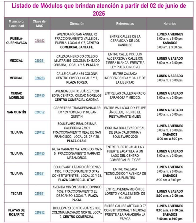 Informó que por el momento se tiene proyectado que para el 9 de junio se reaperture el Módulo 020151 ubicado en Centro Comercial Corona en Mexicali. Y en el caso del municipio de Tijuana se extenderá el horario de los MAC hasta las 8:00 p.m. de lunes a viernes de los Módulos 020452 y 020453, el primero ubicado en Plaza Oasis y el segundo en el fraccionamiento Mariano Matamoros.