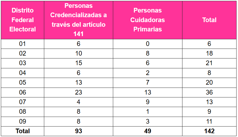 En este tenor, el listado nominal de Voto Anticipado en Baja California quedó conformado por un total de 142 registros de ciudadanas y ciudadanos que podrán emitir su voto en la jornada del voto anticipado, de los cuales 78 corresponden a mujeres y 64 a hombres, desagregados de la siguiente forma en los nueve Distrito Federales: