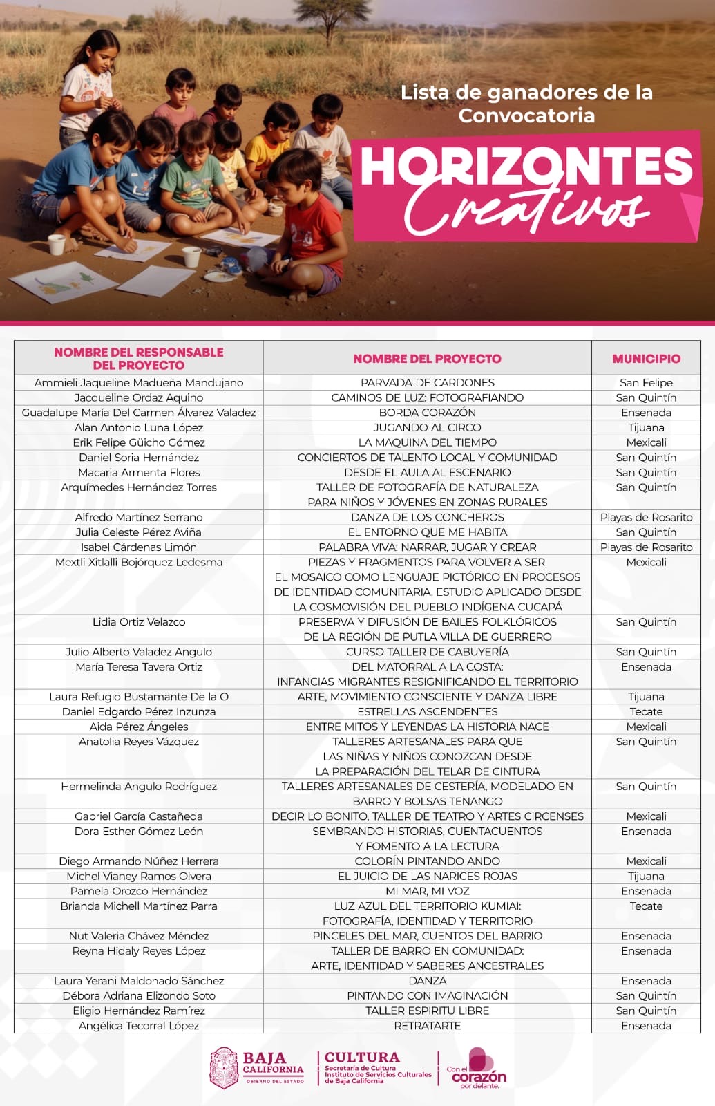 - Un total de 32 proyectos provenientes de los siete municipios de Baja California fueron seleccionados en la convocatoria Horizontes Creativos, impulsada por la Secretaría de Cultura del Estado, bajo la titularidad de Alma Delia Ábrego Ceballos.