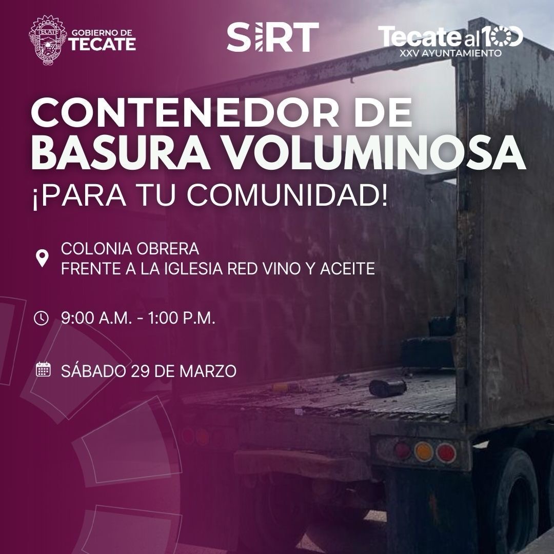 En atención a las solicitudes ciudadanas y reafirmando el compromiso con una ciudad más limpia y ordenada, el Sistema Integral de Residuos de Tecate (SIRT) instalará este sábado 29 de marzo contenedores especiales para la recolección de basura voluminosa en las colonias La Bondad y Obrera.