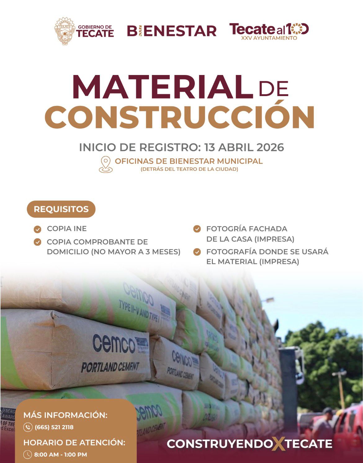 Con el compromiso de mejorar la calidad de vida de las familias tecatenses, el Gobierno del alcalde Román Cota, informa a la ciudadanía que a partir del próximo lunes 13 de abril estará abierta la convocatoria para acceder al programa “Construyendo X Tecate”, el cual tiene como objetivo apoyar a las y los habitantes del municipio con material de construcción para el mejoramiento de sus viviendas.