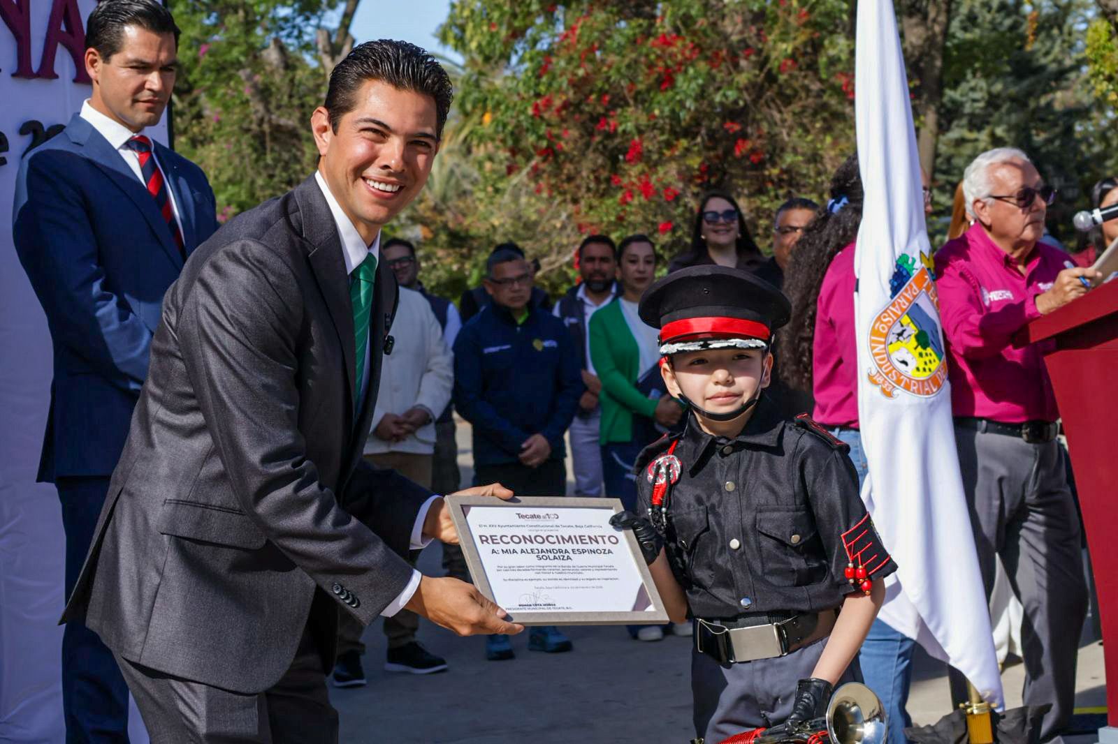 La ceremonia fue encabezada por el alcalde Román Cota Muñoz, quien tuvo el alto honor de realizar el protocolo oficial de toma de protesta y entrega del Lábaro Patrio a escoltas de nivel preescolar, primaria, secundaria e instituciones de carácter social, encomendándoles, en nombre de México, honrar y defender con lealtad y constancia el símbolo patrio que les fue confiado, reafirmando el compromiso de su administración con la formación cívica de la niñez y juventud tecatense.