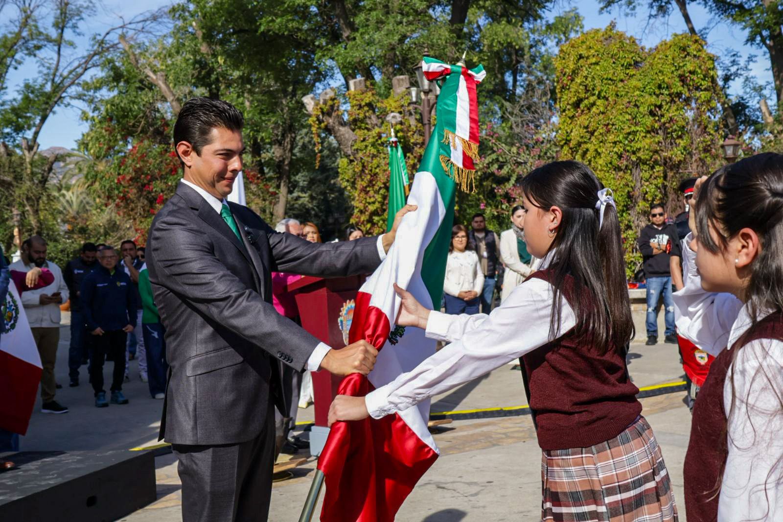La ceremonia fue encabezada por el alcalde Román Cota Muñoz, quien tuvo el alto honor de realizar el protocolo oficial de toma de protesta y entrega del Lábaro Patrio a escoltas de nivel preescolar, primaria, secundaria e instituciones de carácter social, encomendándoles, en nombre de México, honrar y defender con lealtad y constancia el símbolo patrio que les fue confiado, reafirmando el compromiso de su administración con la formación cívica de la niñez y juventud tecatense.