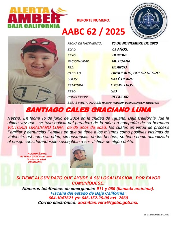 • La Fiscalía General de Baja California ha activado la Alerta Amber para localizar a Santiago Caleb Graciano Luna de 5 años de edad.