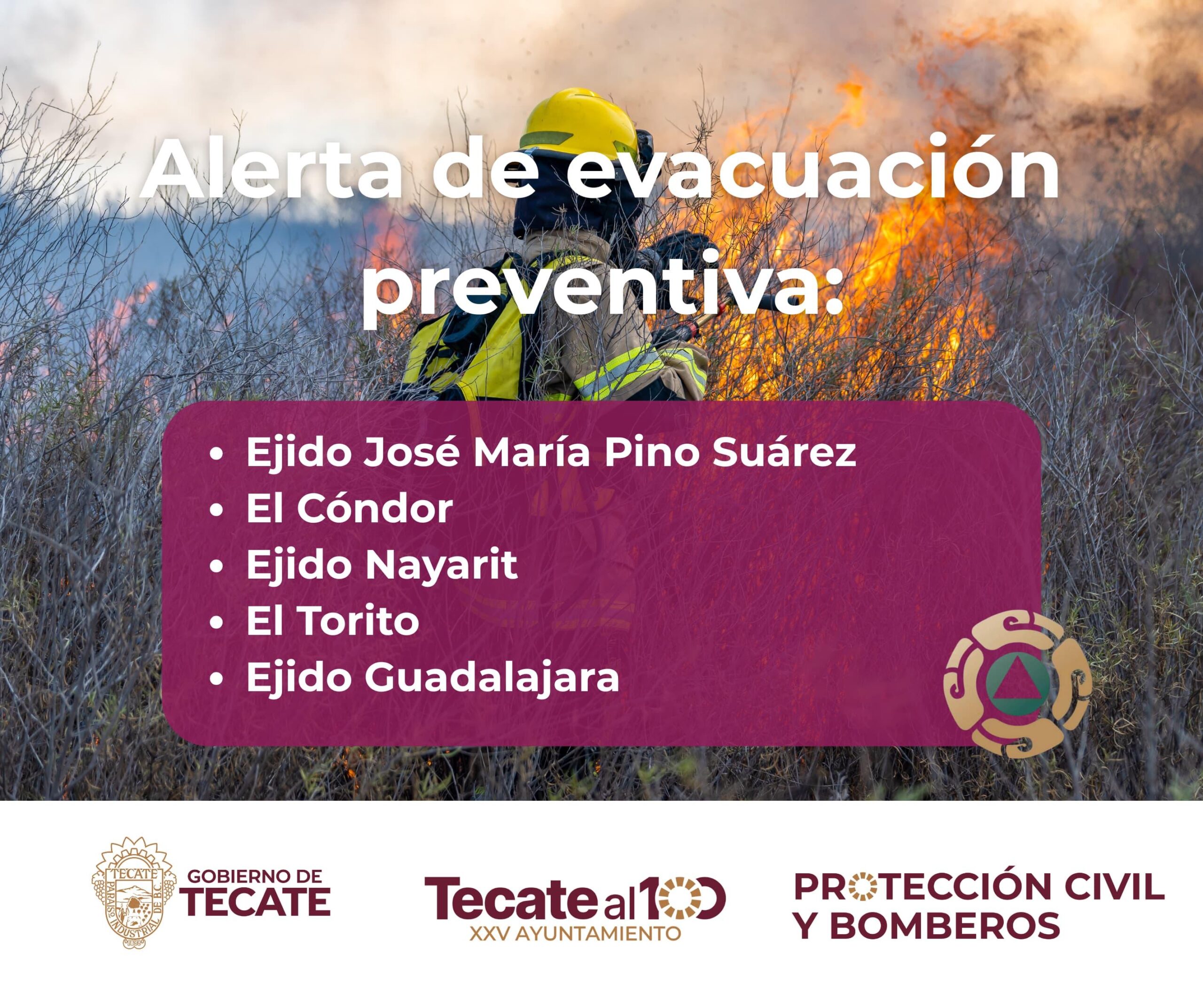 • El Gobierno de Tecate informa que, debido a los incendios forestales que continúan activos en el Ejido Guadalajara y la zona fronteriza, se mantiene vigente la Alerta de Evacuación Preventiva para las comunicades del Ejido José María Pino Suárez, El Cóndor, Ejido Nayarit y El Torito.