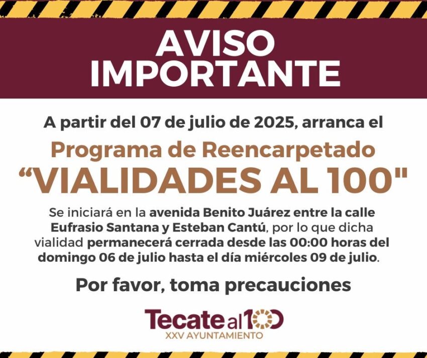 • Se informa a la ciudadanía que la avenida Benito Juárez permanecerá cerrada en el tramo comprendido entre las calles Eufrasio Santana y Esteban Cantú, a partir de las 00:00 horas del domingo 6 de julio y hasta el miércoles 9 de julio.