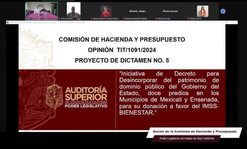 Se refiere a una Iniciativa de Decreto para desincorporar del dominio público del Gobierno del Estado ocho predios ubicados en el municipio de Mexicali y cuatro en el municipio de Ensenada para su enajenación a título gratuito en favor del IMSS Bienestar, y fue aprobada por seis votos a favor, cero en contra y cero abstenciones.