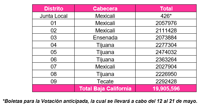 En el caso de Baja California, cada distrito electoral federal recibió el siguiente número de boletas electorales: