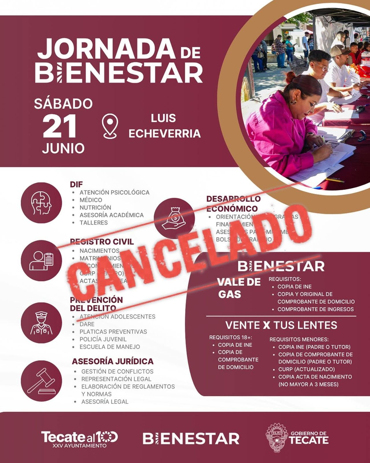 - La Jornada de Bienestar programada para este sábado 21 de junio a partir de las 9:00 a.m. en la delegación Luis Echeverría queda cancelada por motivos de seguridad debido a los incendios registrados en la zona.