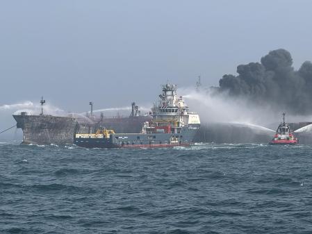 Las imágenes que llegan del lugar mostraban una enorme columna de humo proveniente de un gigantesco incendio sobre el mar.