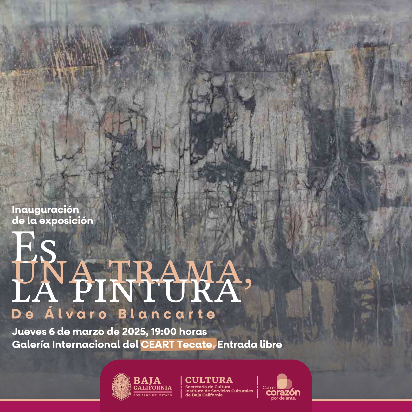 Este jueves 6 de marzo, a las 19:00 horas, en el Centro Estatal de las Artes (CEART) Tecate se inaugurará la exposición «Es una trama: La pintura” de Álvaro Blancarte, uno de los artistas más influyentes de nuestra época. La muestra es un homenaje a su vasta trayectoria y se exhibirá en la Galería Internacional que lleva su nombre.