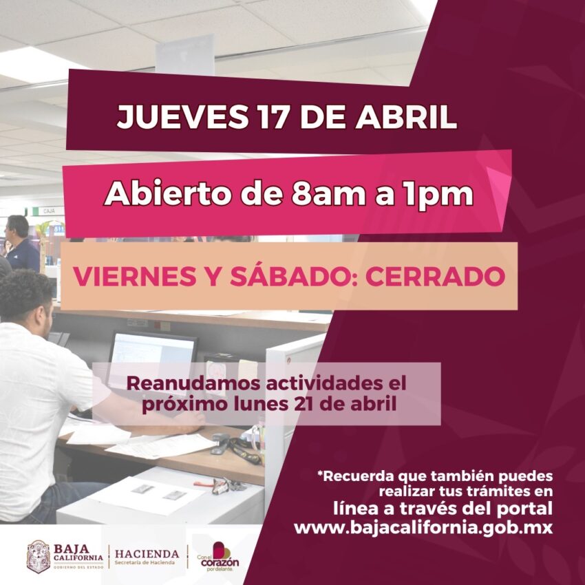 El Servicio de Administración Tributaria de Baja California (SAT BC) informa que el próximo viernes 18 y sábado 19 de abril las oficinas de recaudación de rentas y módulos del Repuve permanecerán cerradas con motivo de los días de semana santa.