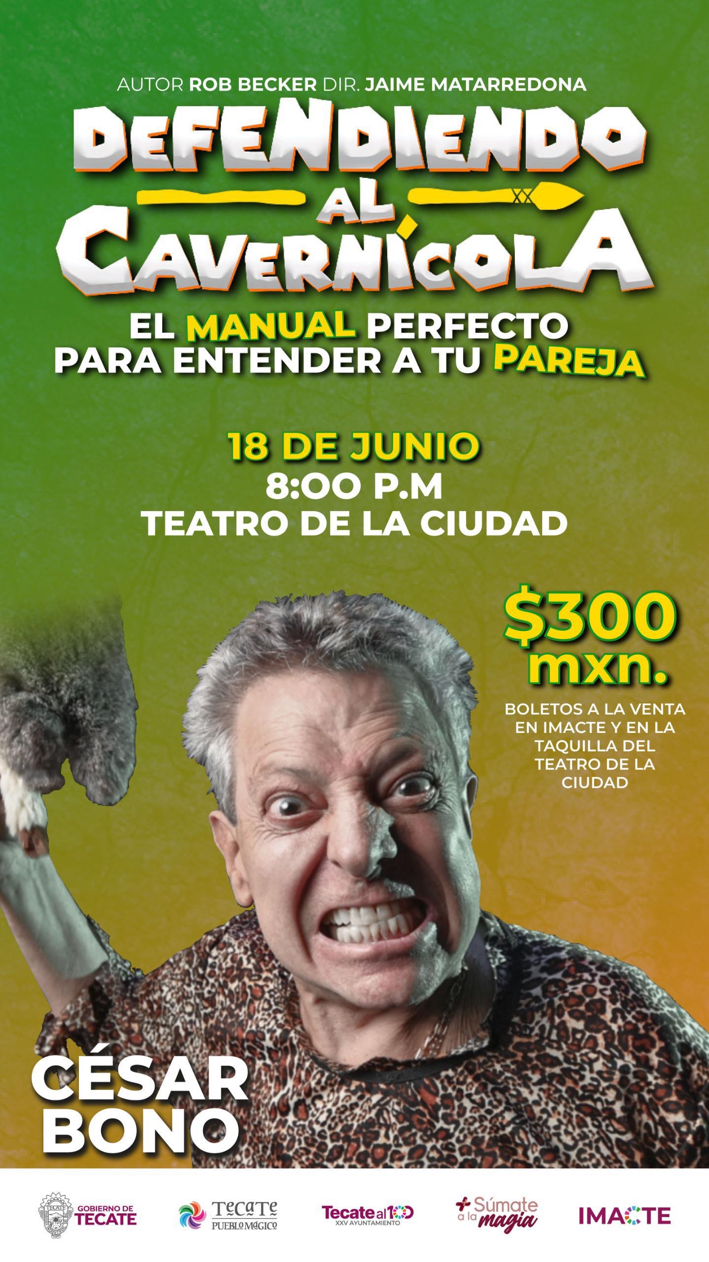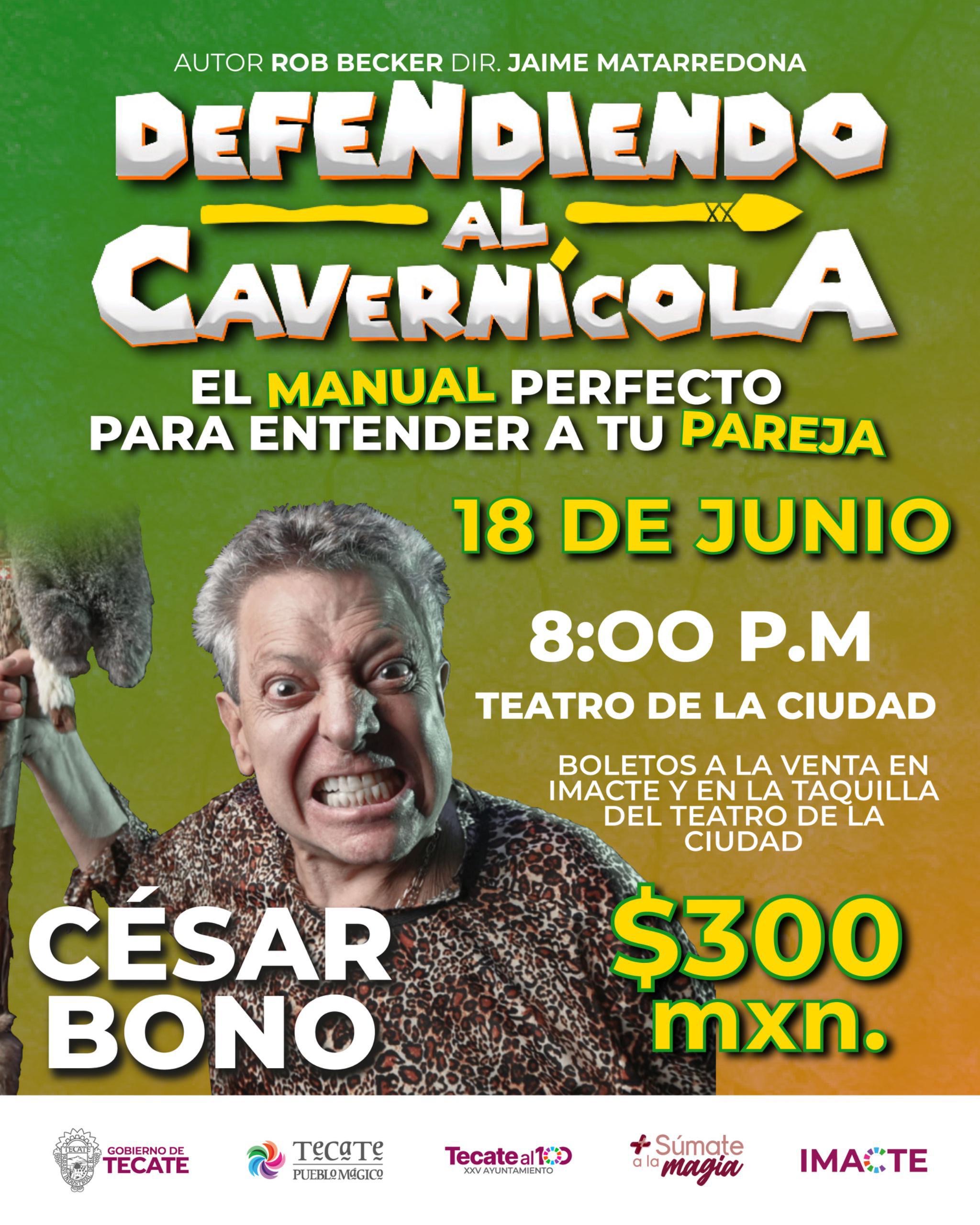 • El Gobierno de Tecate, a través del Instituto Municipal de Arte y Cultura de Tecate (IMACTE), invita a la ciudadanía a disfrutar de una noche llena de humor y reflexión con la presentación del monólogo “Defendiendo al Cavernícola”, protagonizado por el querido actor César Bono, como parte de su gira del adiós.