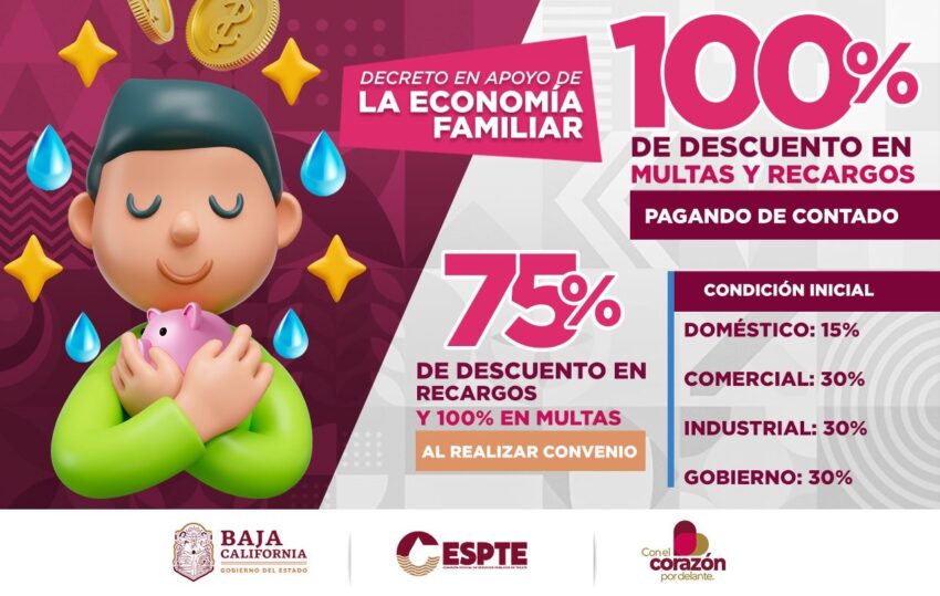 La Comisión Estatal de Servicios Públicos de Tecate (CESPTE) informa a la comunidad sobre la entrada en vigor del Decreto de Condonación de Multas y Recargos por consumo de agua potable, el cual beneficia tanto a usuarios domésticos como comerciales. Este apoyo aplica para los adeudos generados con anterioridad al 28 de marzo de 2025.