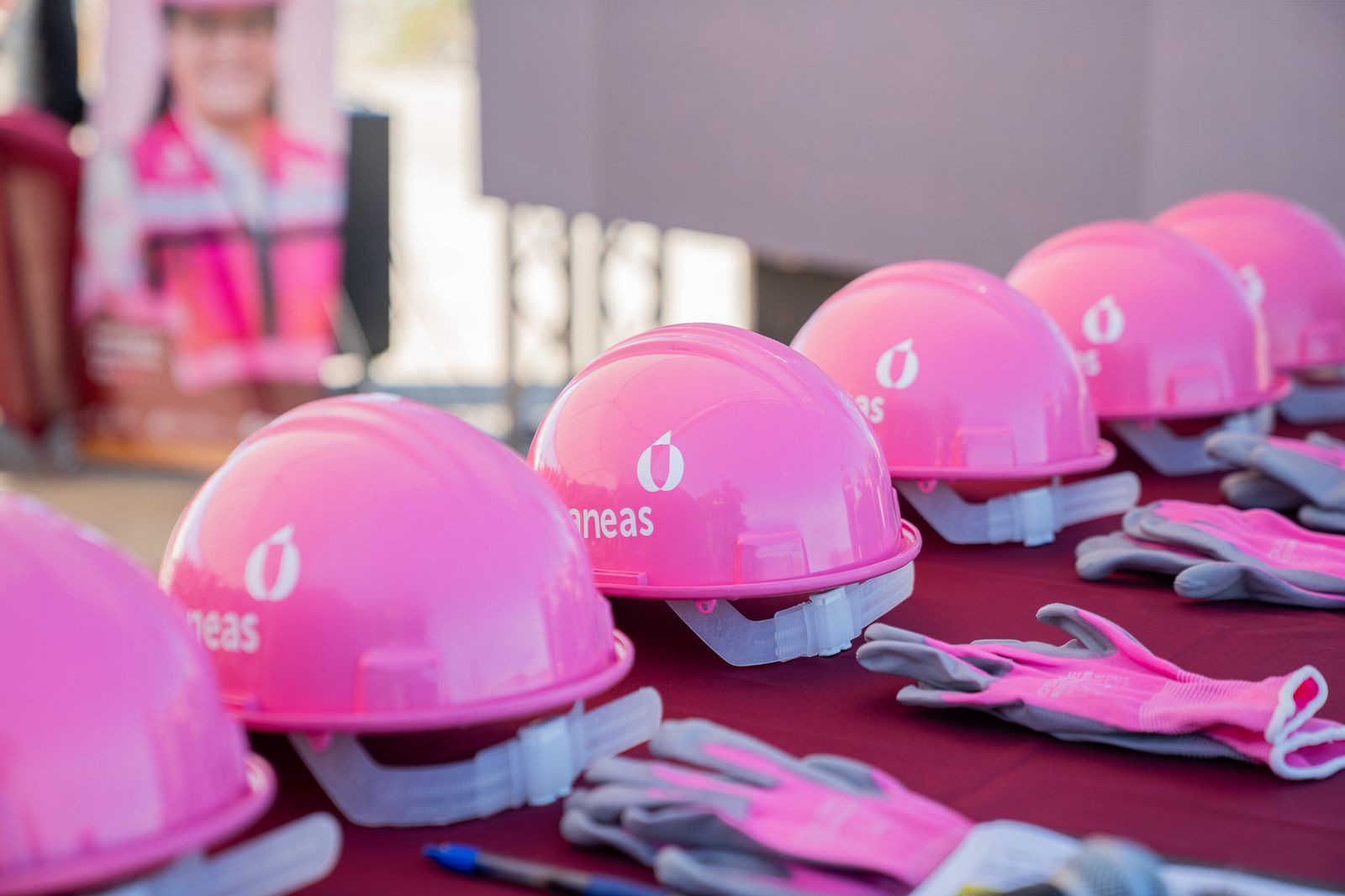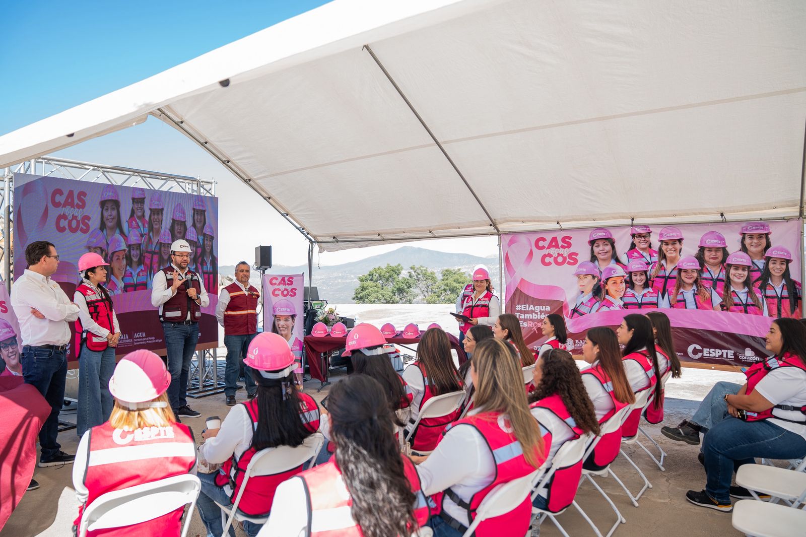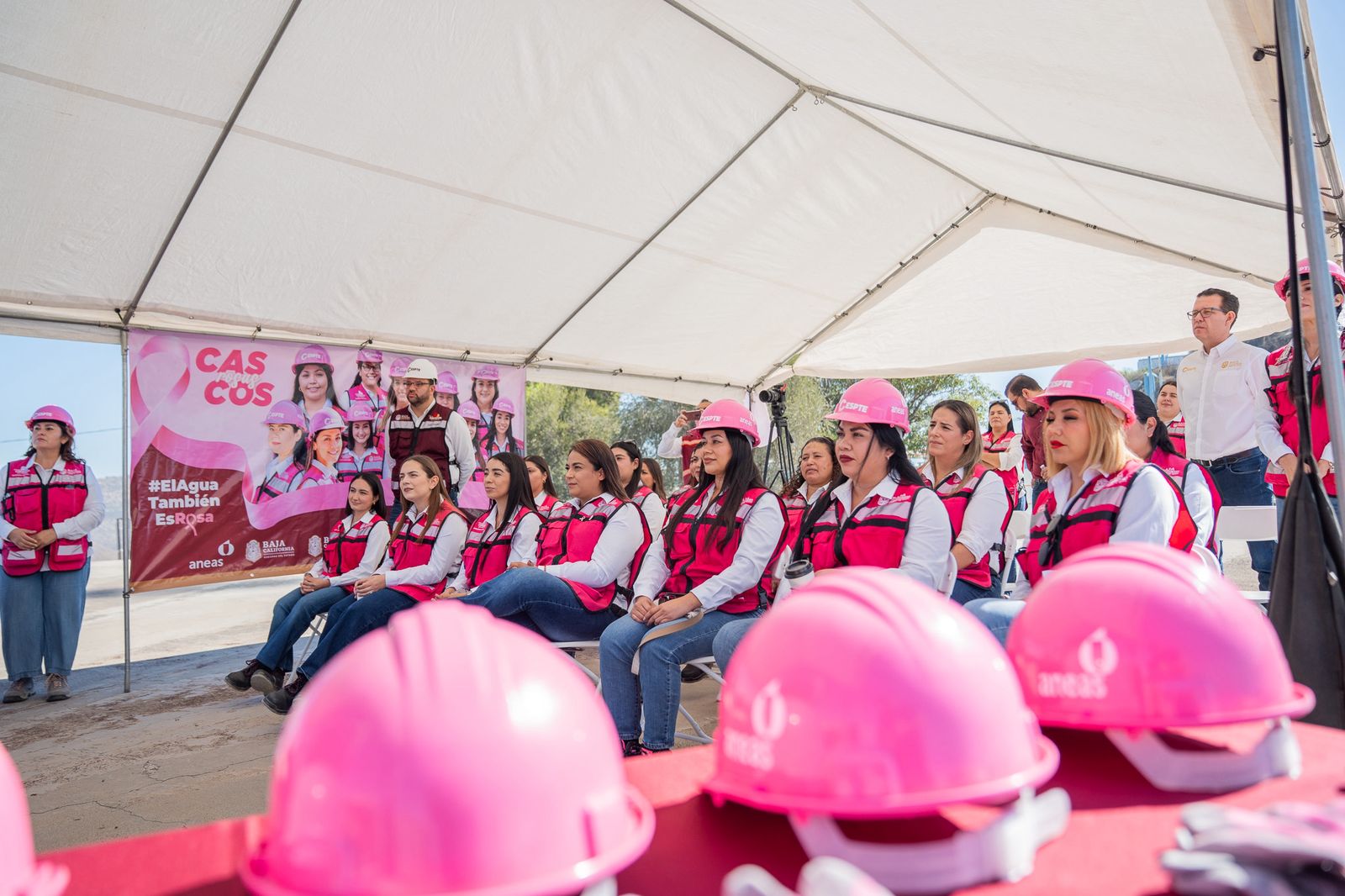 Por último, las autoridades presentes realizaron con orgullo y entusiasmo, la entrega de Cascos Rosas a las compañeras: Valeria Martínez Hernández, Heidi Cazares Ayala, Fernanda Gómez Navarro, Aylin Ortiz Guerra, Frida Sahían Arredondo Carlón, Martha Aceves Arias, Andreina Mercado Salazar, Janett Mariscal Rodríguez, Jessenia Castro Gil, Cynthia Karina Solís Villafuerte, Marisol Alejandra Rentería Hernández y Celina Araceli Rodríguez Guzmán de CESPTE, junto a compañeras de CESPT como Sugehit Cecilia Valdez Verduzco, Martha Angélica Linares Vega, Mercedes Yudith Rocha Flores y Maritza Yuliana Torres Barrios, así como de CESPE como Sandra Karen Villalobos Salas y Maricela Magaña Ramos, esto como símbolo del compromiso, la fuerza y el liderazgo de las mujeres que día a día transforman el sector hídrico en Baja California.