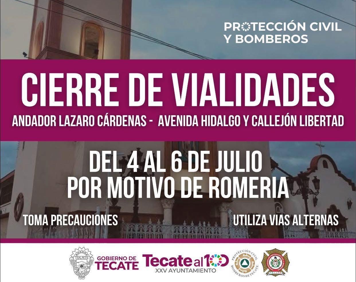 - La Coordinación Municipal de Protección Civil y Bomberos de Tecate informa que se realiza cierre de vialidades por motivo de la Romería de verano 2025, del 04 al 07 de julio.