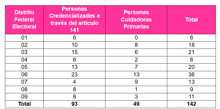 podrán emitir su voto en el periodo de votación anticipada, de los cuales 78 corresponden a mujeres y 64 a hombres, desagregados de la siguiente forma en los nueve Distritos Federales:
