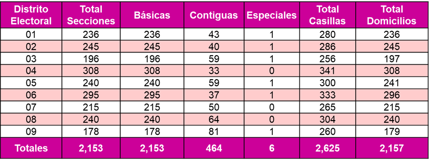 Como referencia se destaca que, en el Proceso Electoral Federal 2023-2024, se instalaron casillas en 2,269 domicilios, por lo que, para este Proceso Electoral Extraordinario, los 2,157 domicilios en los que se instalarán casillas representan un 95% del número de domicilios en los que se instalaron casillas el pasado 2 de junio de 2024.