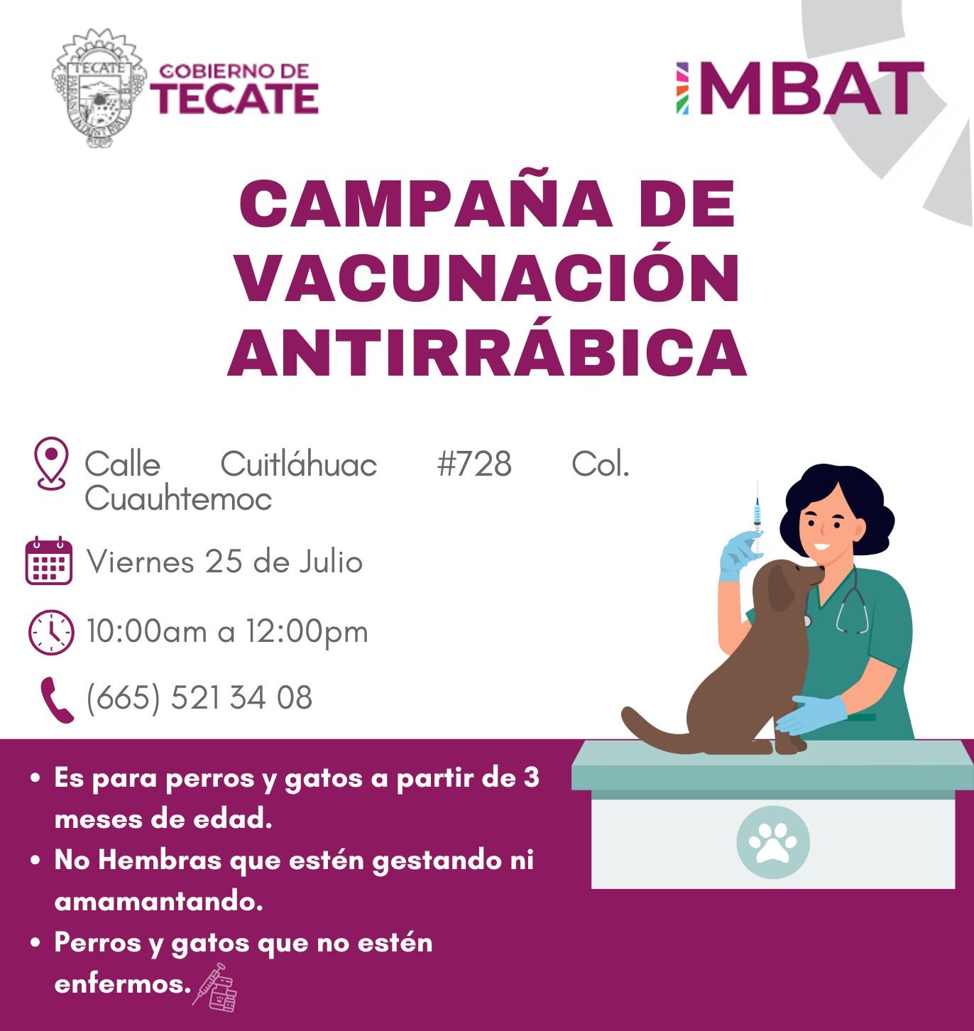 - Con el compromiso de seguir promoviendo la salud pública y el bienestar animal, el Gobierno de Tecate, a través del Instituto Municipal de Bienestar Animal (IMBAT), continúa recorriendo diversas colonias del municipio con su Campaña de Vacunación Antirrábica Gratuita, brindando a las familias la oportunidad de proteger a sus mascotas contra esta enfermedad.