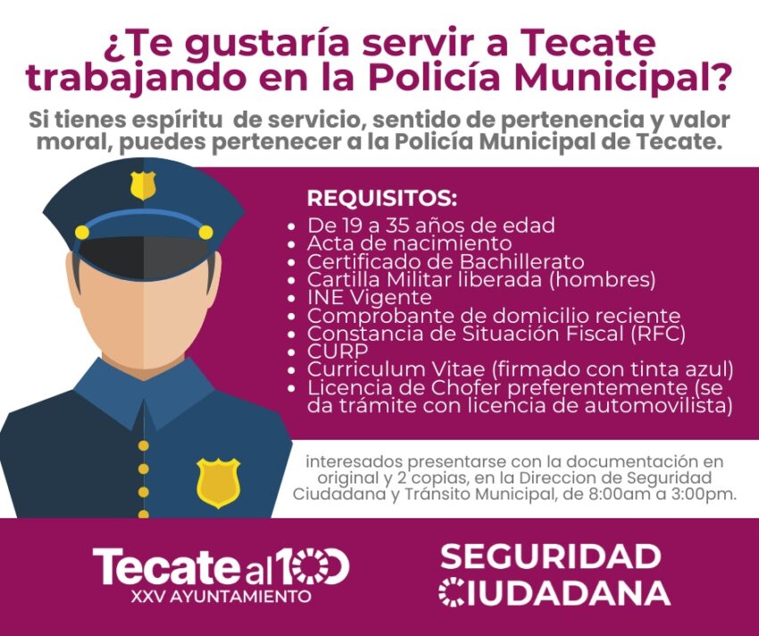 El Gobierno de Tecate convoca a mujeres y hombres de entre 19 y 35 años, con espíritu de servicio, sentido de pertenencia y valor moral a sumarse a las filas de la Dirección de Seguridad Ciudadana y Tránsito Municipal como nuevas y nuevos elementos de la Policía Municipal.