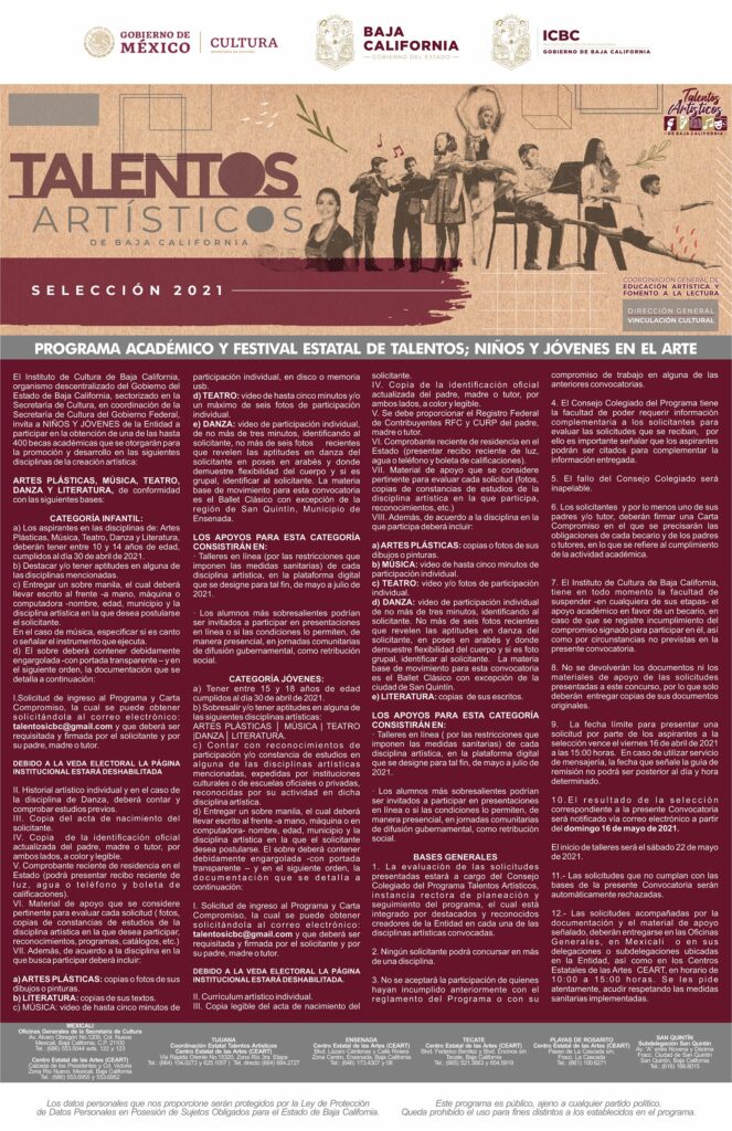 La Secretaría de Cultura de Baja California anuncia que el Institutode Cultura de Baja California en coordinación con la Secretaría de Cultura federal, abre la convocatoria de becas 2021 del Programa Talentos Artísticos.