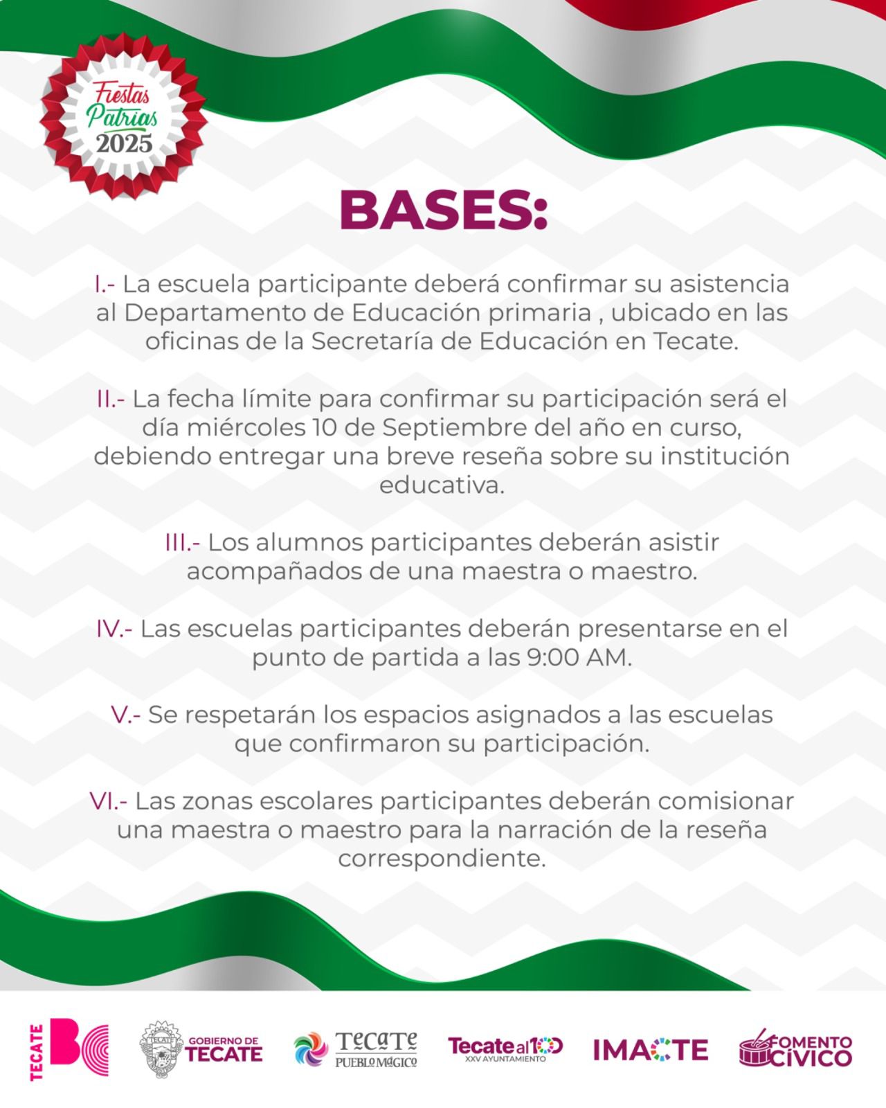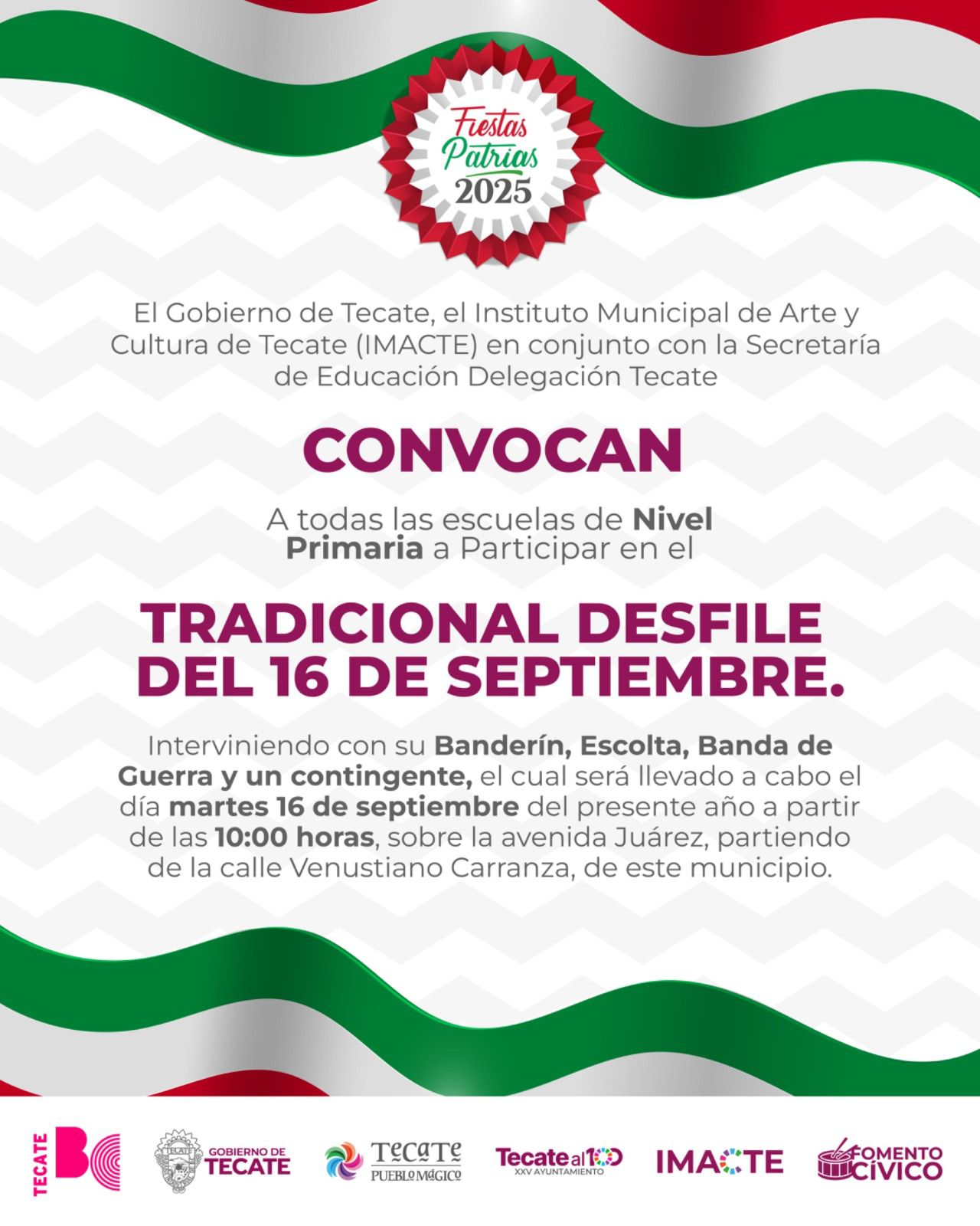 • El Gobierno de Tecate, a través del Instituto Municipal de Arte y Cultura de Tecate (IMACTE), en coordinación con la Secretaría de Educación, Delegación Tecate, invita a todas las escuelas de nivel primaria del municipio a formar parte del Tradicional Desfile Cívico del 16 de Septiembre, en conmemoración del 215 aniversario del inicio de la Independencia de México.