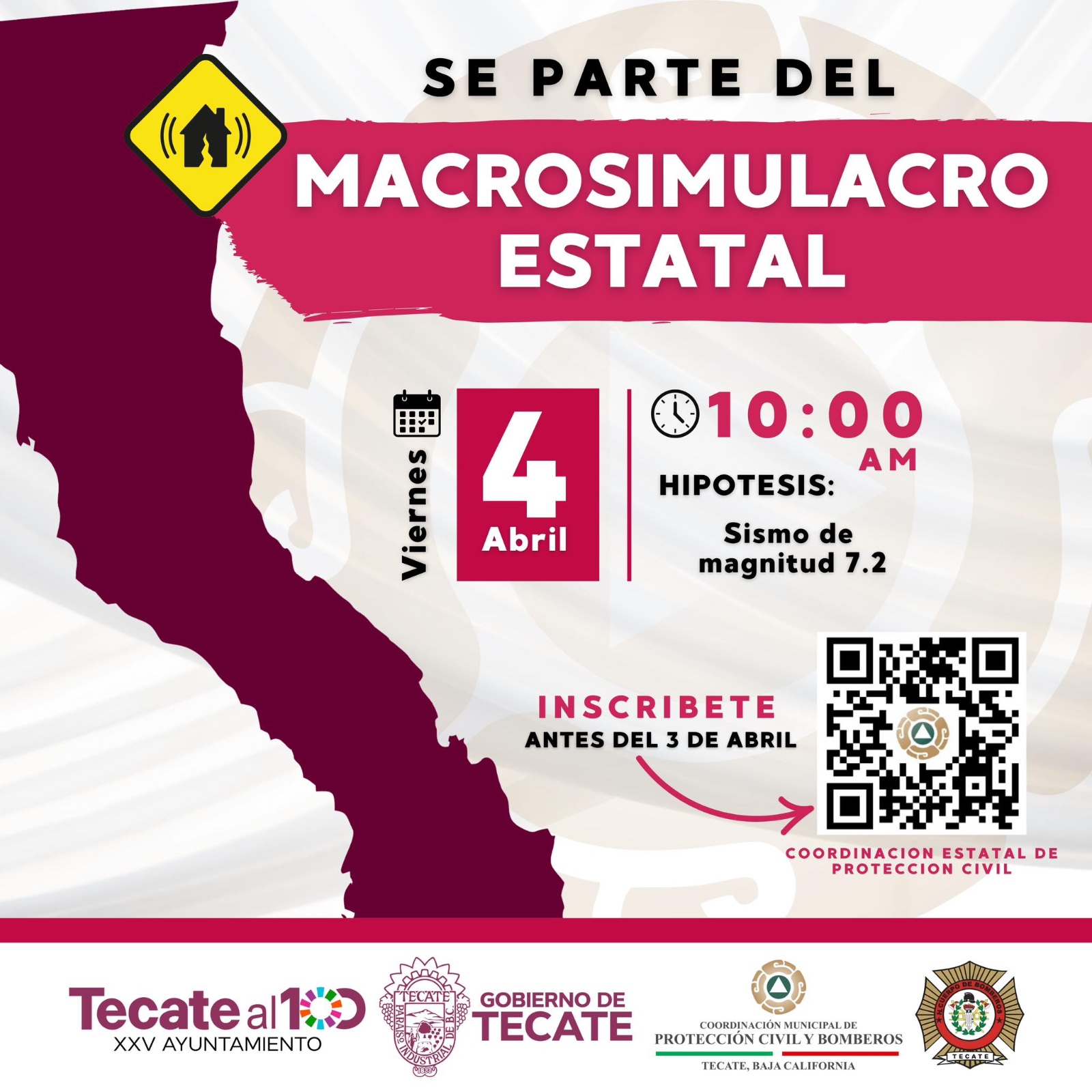 La Coordinación Municipal de Protección Civil y Bomberos de Tecate invita a la comunidad, empresas y propietarios de inmuebles a participar en el Macrosimulacro Estatal 2025, un ejercicio de prevención y respuesta ante emergencias que se llevará a cabo el próximo 4 de abril a las 10:00 a.m.