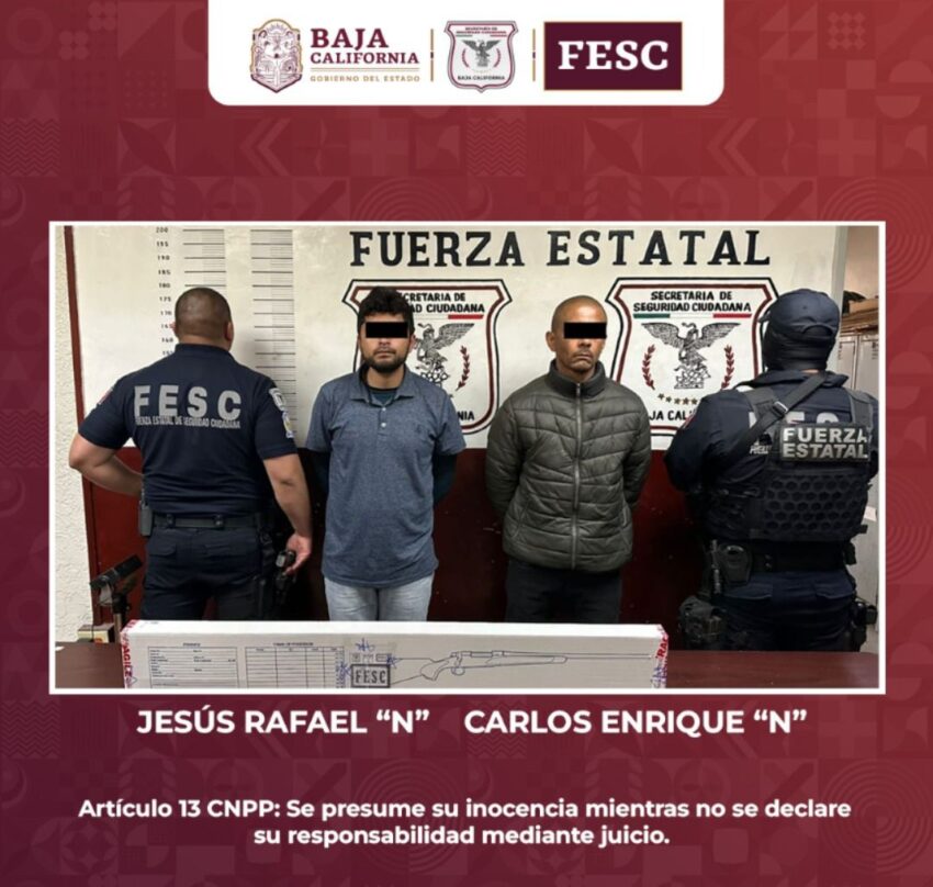 Por esta razón, se les colocaron candados de mano a Jesús Rafael “N”, de 28 años y originario de Tijuana y Carlos Enrique “N”, de 42 años y originario de Tecate. Se informa que ambos hombres fueron puestos a disposición de la Fiscalía General de la República (FGR) con sede en Mexicali.