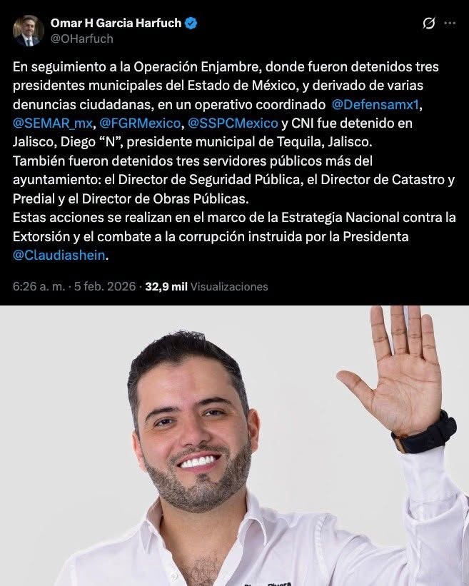 En un operativo federal de alto impacto, autoridades detuvieron a Diego Rivera Navarro, presidente municipal de Tequila, Jalisco, militante de Morena, por su presunta participación en una red de extorsión a comerciantes y empresarios, así como por posibles vínculos con el crimen organizado.