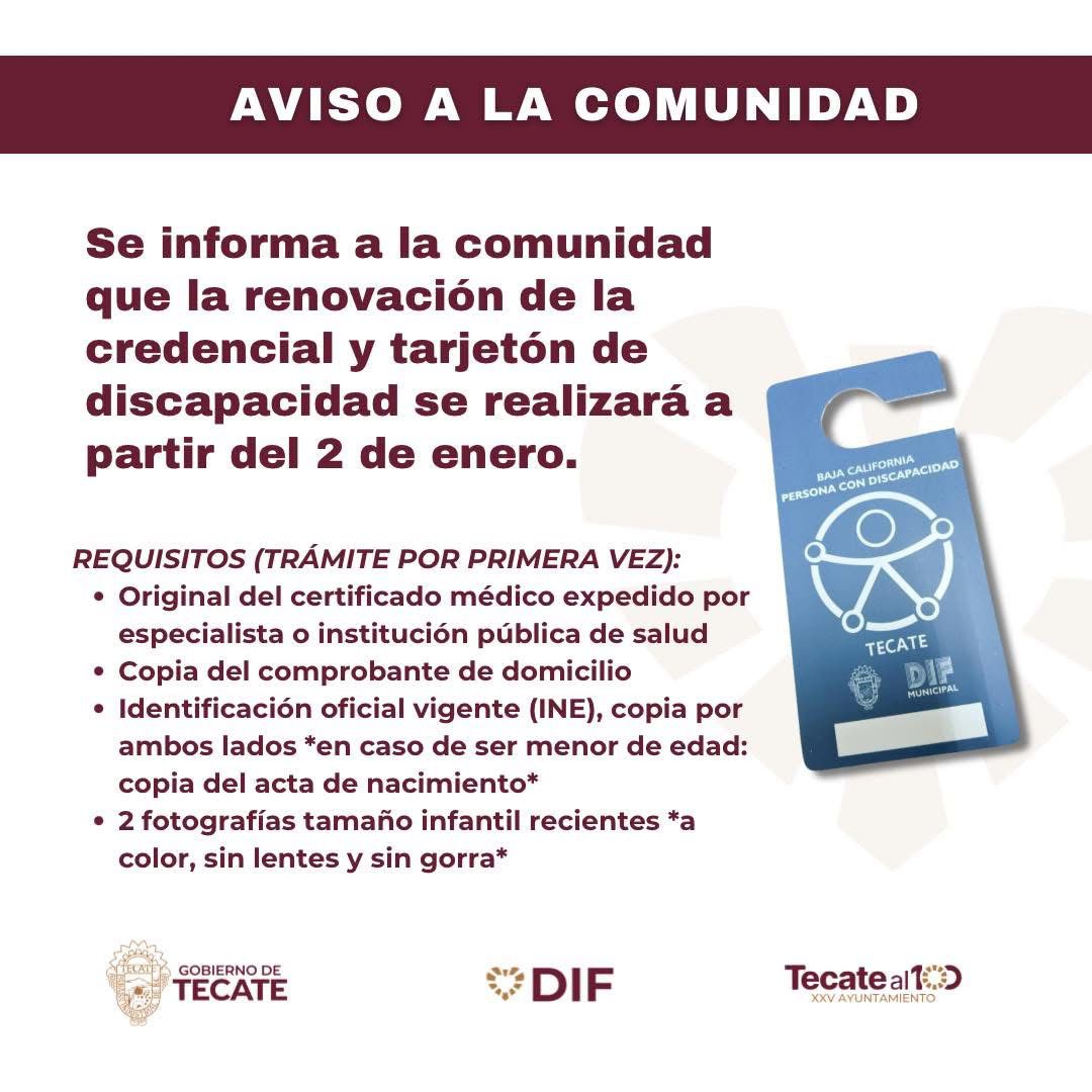 El Gobierno de Tecate, a través de DIF Municipal, comunica a la ciudadanía que a partir del 2 de enero iniciará el proceso de renovación de la credencial y tarjetón para personas con discapacidad, con el propósito de fortalecer los servicios sociales que impulsen la inclusión, la dignidad y la accesibilidad para todas y todos.