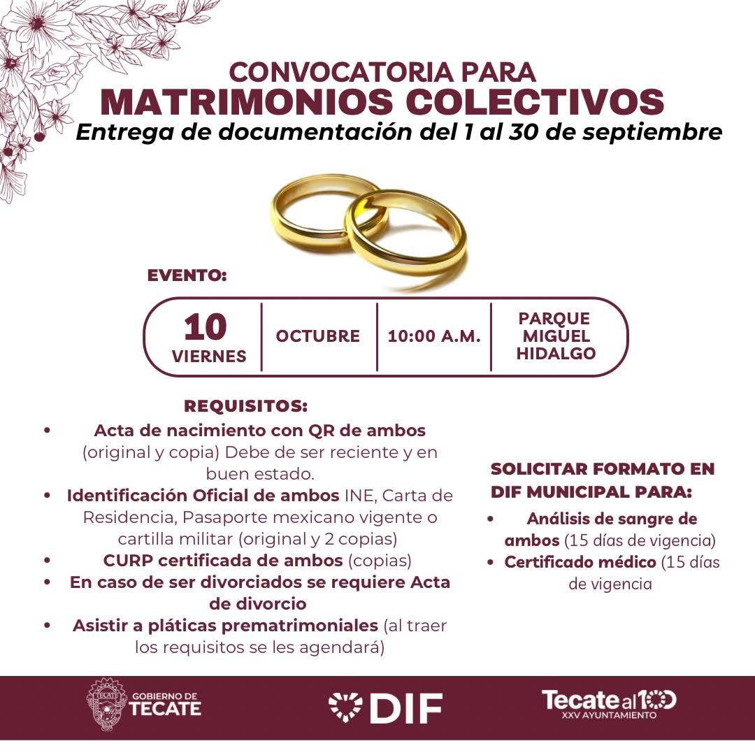 - En el marco del 133 Aniversario de la Ciudad, el Sistema para el Desarrollo Integral de la Familia (DIF) de Tecate, en coordinación con la Oficialía del Registro Civil de la Secretaria del Ayuntamiento, abre la convocatoria para los Matrimonios Colectivos 2025, una iniciativa que busca brindar certeza jurídica a las parejas tecatenses y fortalecer la unión familiar.