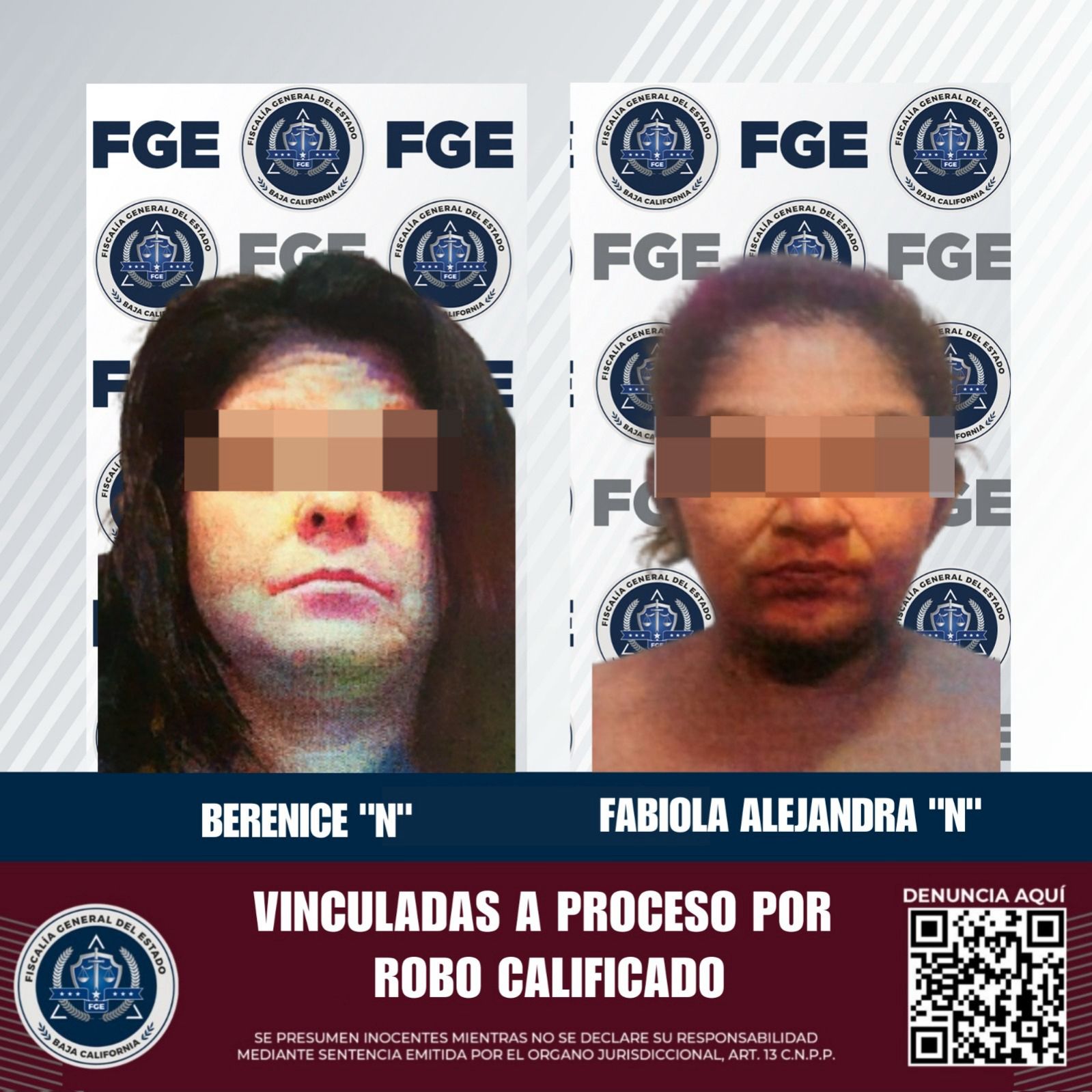 Gracias a la presentación de datos de prueba contundentes, de la Unidad de Investigación Especializada en Robos, Zona Centro, adscrita a la Fiscalía Regional de Tijuana, se logró que se impusiera la medida cautelar de prisión preventiva justificada a dos mujeres, señaladas por su presunta responsabilidad en el delito de robo calificado cuando se cometa en establecimiento comercial abierto al público, en hechos distintos.