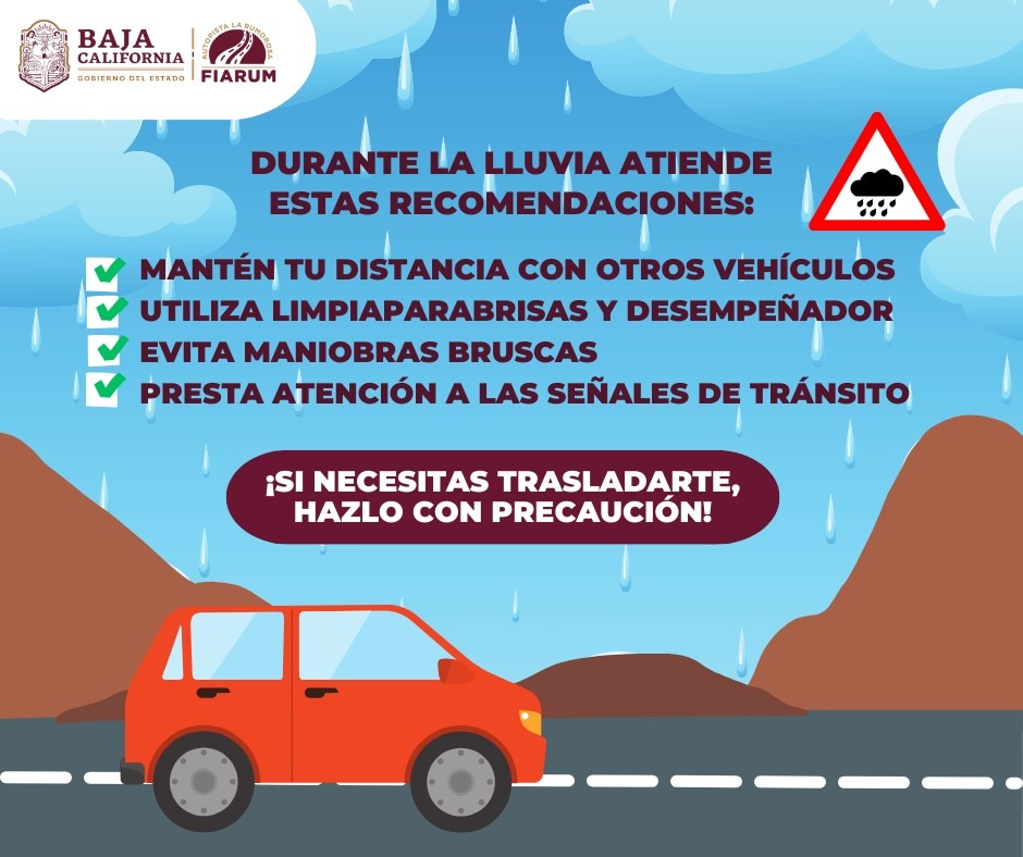 Ante el pronóstico de lluvias en distintos puntos de la entidad y el descenso de temperaturas, el Fideicomiso Público de Administración de Fondos e Inversión del Tramo Carretero Centinela – La Rumorosa (FIARUM) emite recomendaciones a automovilistas que requieran trasladarse durante los próximos días.
