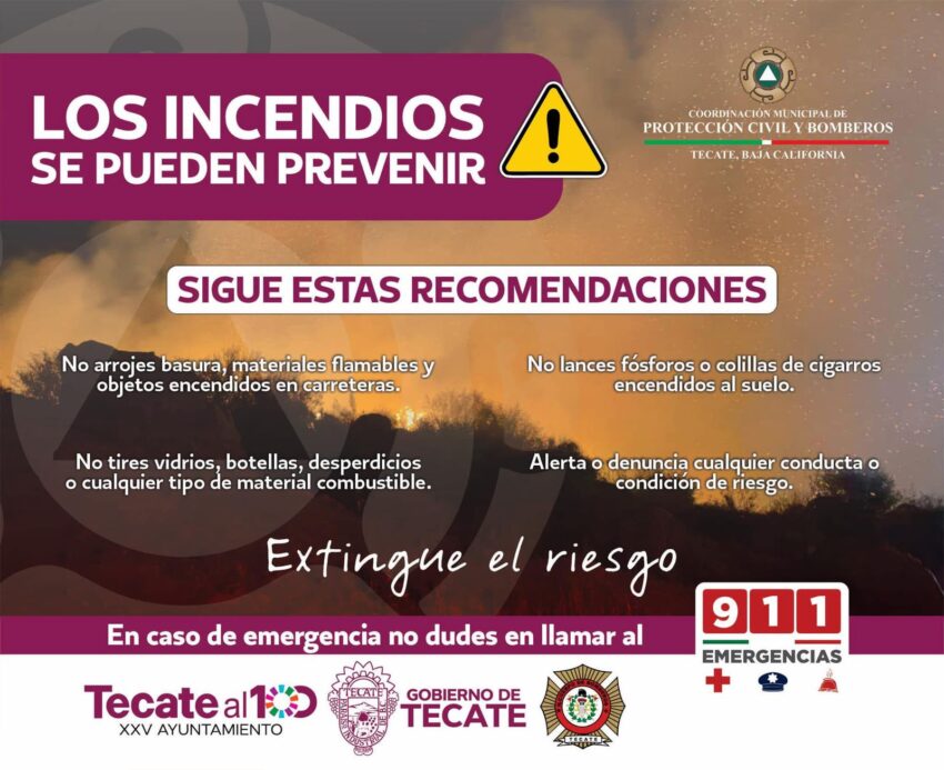 • El Gobierno Municipal de Tecate, encabezado por el alcalde Román Cota Muñoz, a través de la Coordinación Municipal de Protección Civil y Bomberos, hace un llamado a la población a tomar medidas preventivas para evitar incendios forestales y urbanos, especialmente durante las temporadas de mayor riesgo.