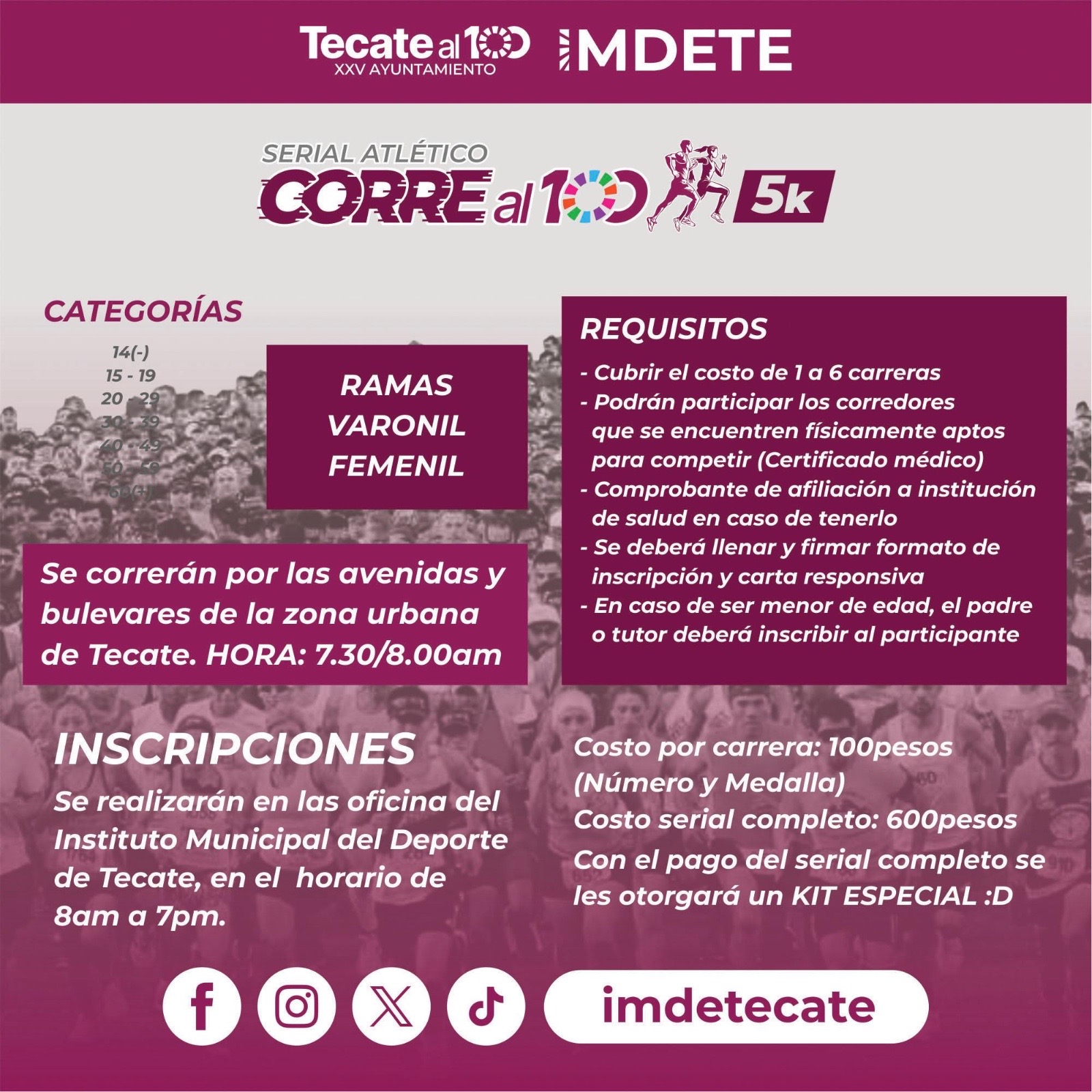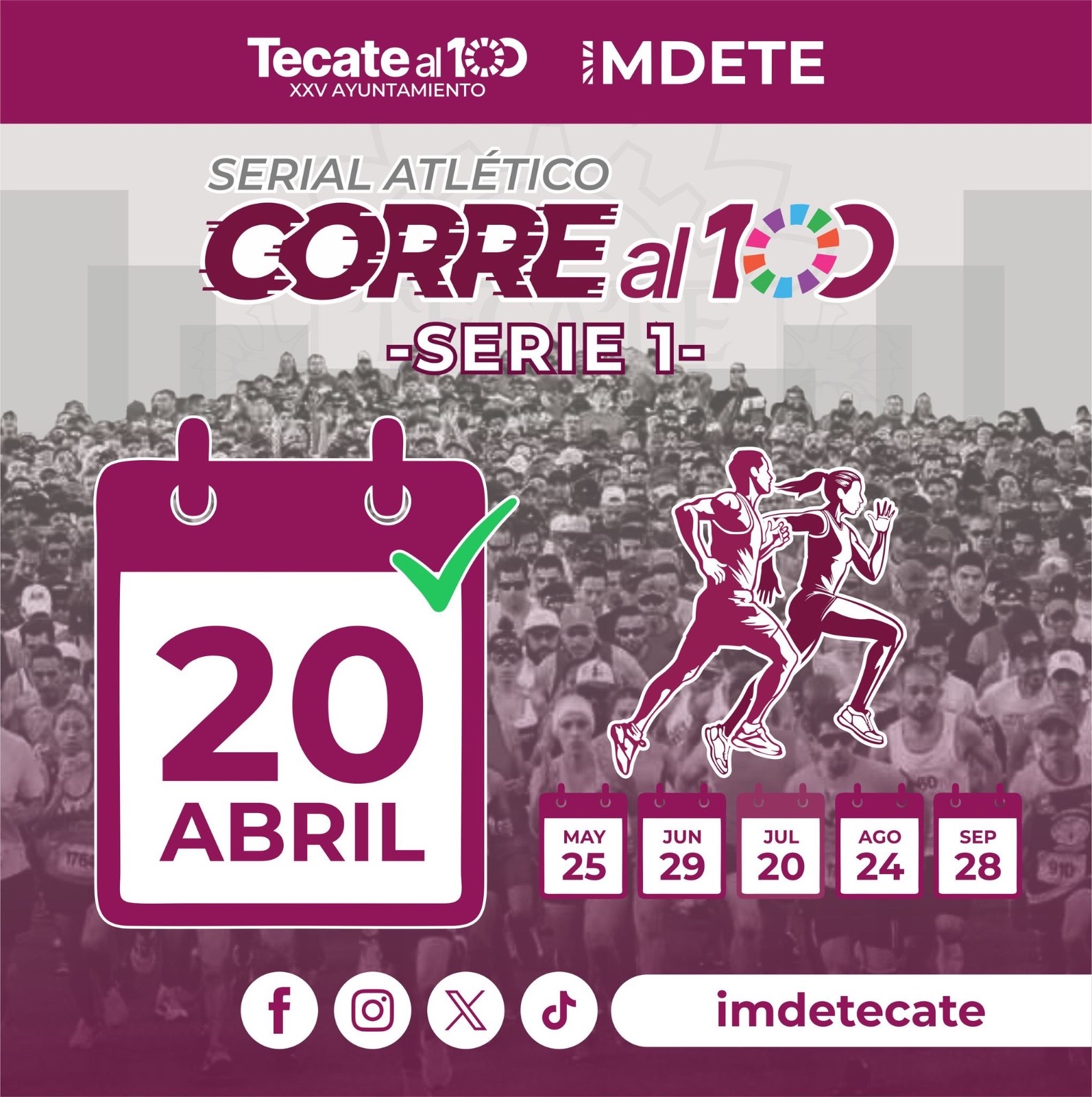 Este domingo 20 de abril marcará el arranque del Serial Atlético “Corre al 100”, una iniciativa del Gobierno de Tecate, a través Instituto Municipal del Deporte de Tecate (IMDETE), que promueve la actividad física, el espíritu deportivo y la sana convivencia familiar.
