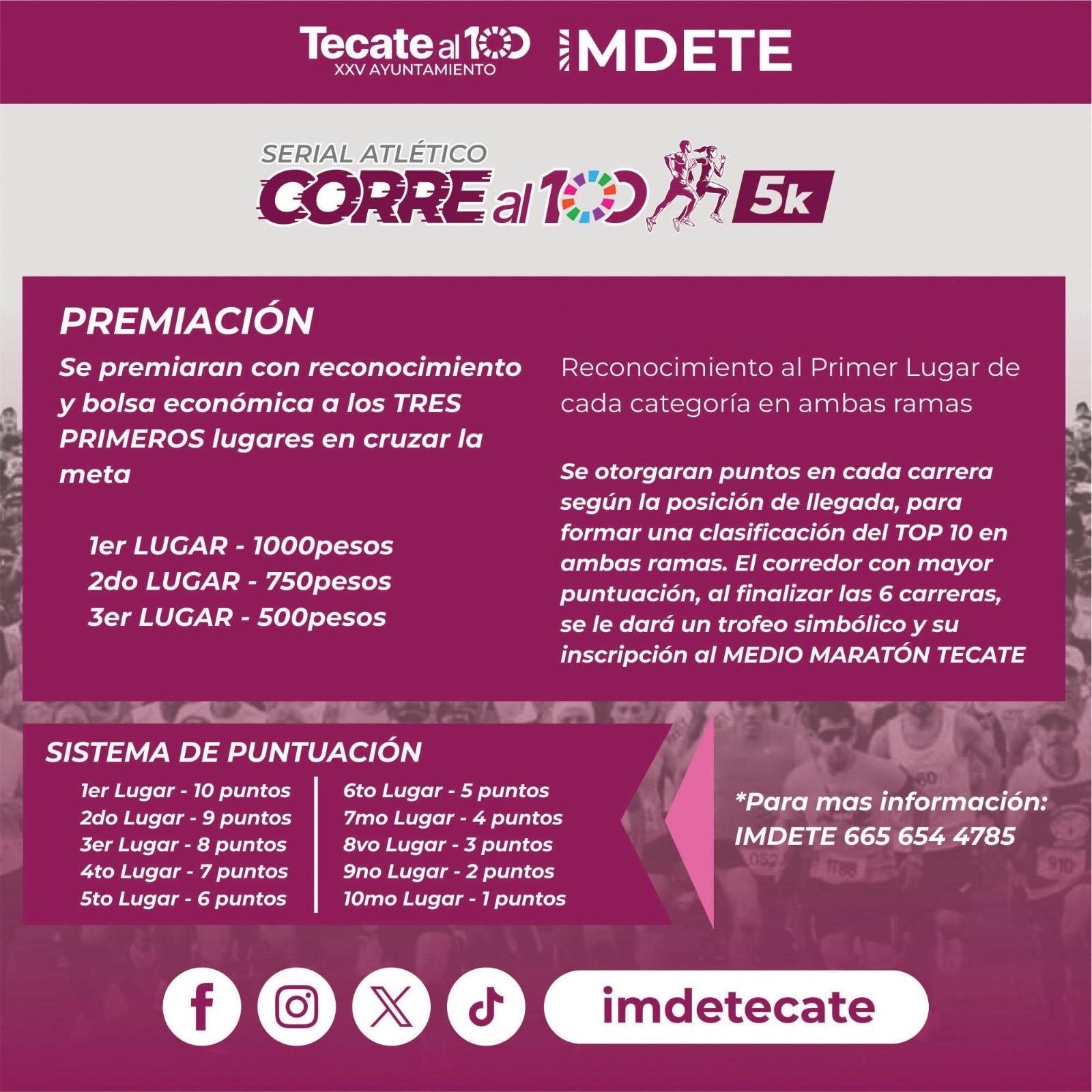 Así mismo, las próximas carreras serán los días 25 de mayo, 29 de junio, 20 de julio, 24 de agosto y 28 de septiembre. Cada corredor acumulará puntos según su posición en cada carrera, buscando colocarse en el Top 10 del serial. Al finalizar las seis fechas, los mejores puntajes recibirán trofeos simbólicos e inscripción gratuita al Medio Maratón Tecate.