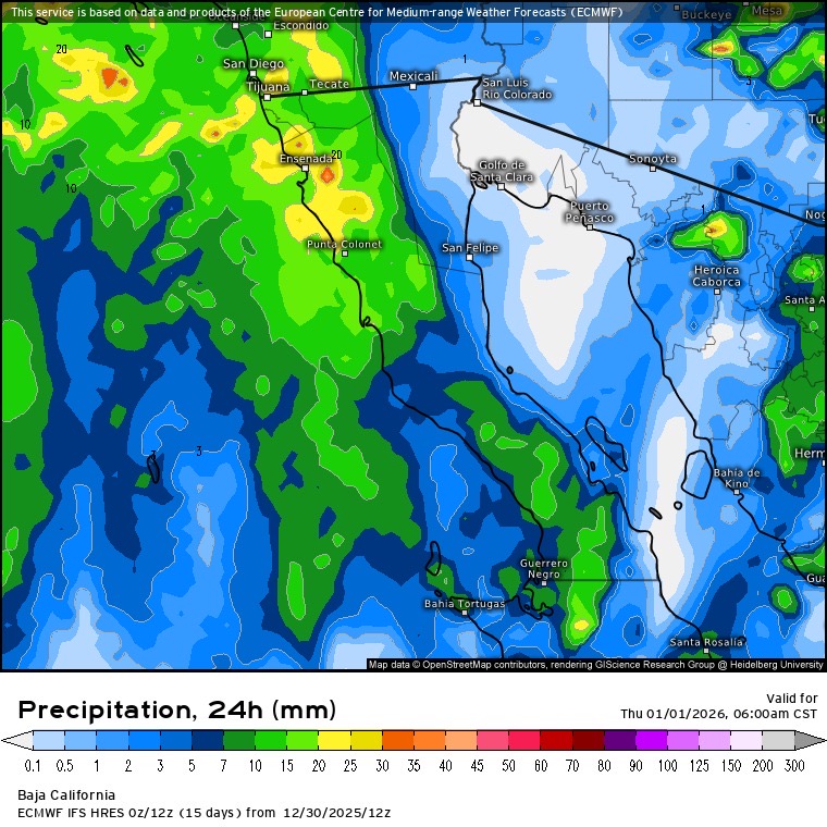 Esta condición meteorológica ocasionará probabilidad de rachas fuertes de viento, lluvias fuertes a muy fuertes e intervalos de chubascos en nuestro estado, así como la probabilidad de caída de nieve o aguanieve durante la noche en la sierra de San Pedro Mártir. Se prevé que, durante la tarde del jueves 1 de enero, la vaguada comience a debilitar, disminuyendo la intensidad de las precipitaciones.