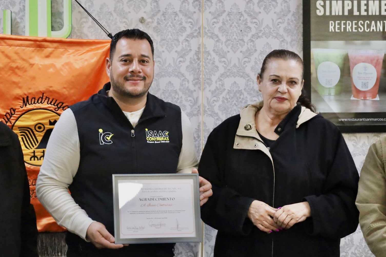 En el marco del 50 aniversario del Grupo Madrugadores de Tecate, A.C., foro de análisis, acción y opinión, se otorgó un reconocimiento a Isaac Contreras por su participación y exposición sobre el Sindicato de Burócratas de Tecate, así como por la presentación de sus propuestas como aspirante a la Secretaría General para el periodo 2026–2029.