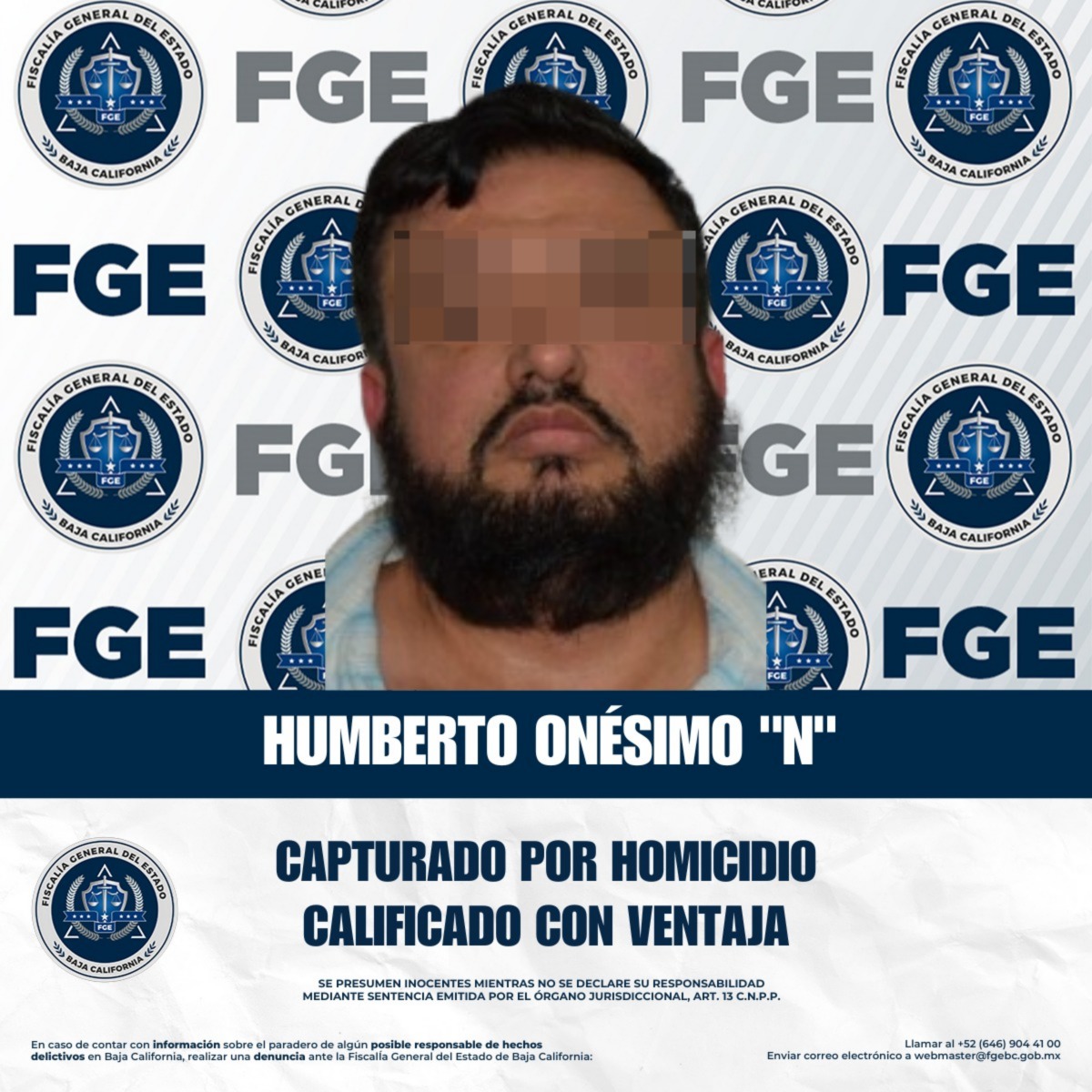 • La Fiscalía General del Estado, a través de la Agencia Estatal de Investigación Zona Tijuana, adscrita a la Unidad Especializada en Delitos contra la Vida, cumplimentó una orden de aprehensión el día 14 de enero de 2026, a las 22:00 horas, en contra de Humberto Onésimo “N”, por su probable responsabilidad en el delito de homicidio calificado con ventaja.