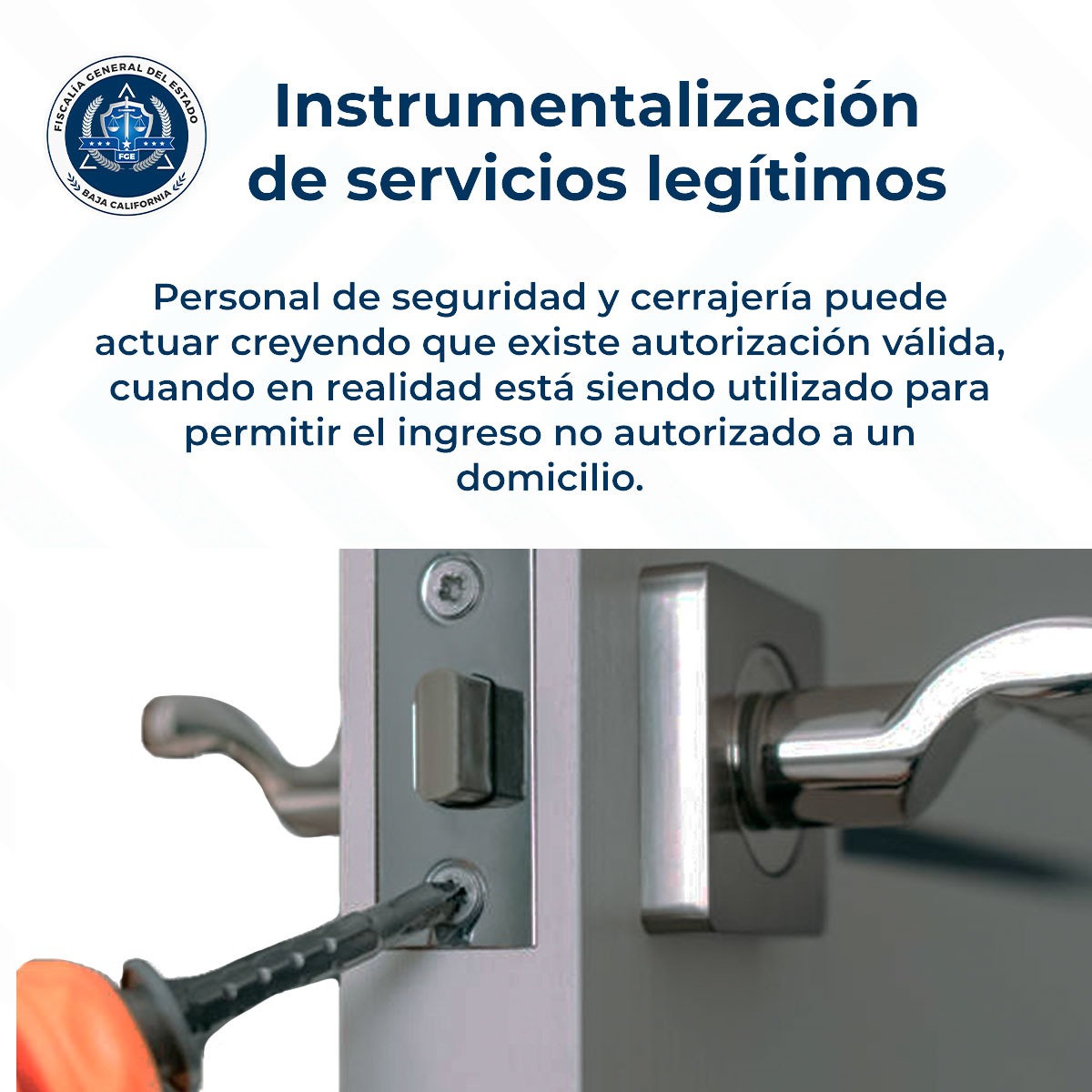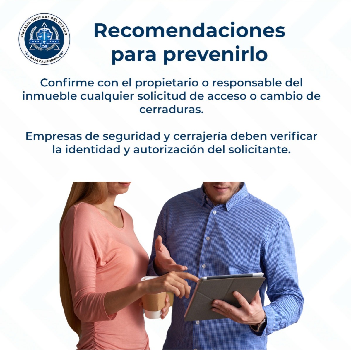 La Fiscalía General del Estado, a cargo de la Dra. Ma. Elena Andrade Ramírez, exhorta a la población a verificar directamente con el propietario o arrendador cualquier trabajo relacionado con accesos, así como a que las empresas del ramo confirmen por escrito la identidad y autorización de quien contrata el servicio. Asimismo, se recomienda no permitir la apertura de domicilios sin acreditar plenamente la propiedad o posesión legal.