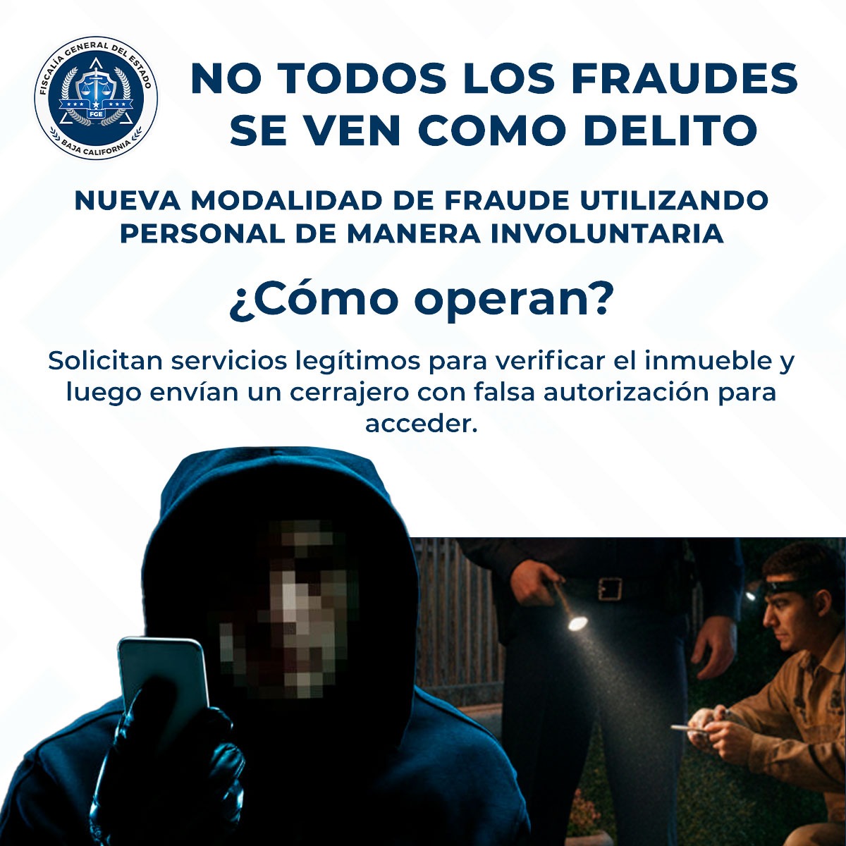 La Fiscalía General del Estado informa a la ciudadanía sobre una nueva modalidad de fraude detectada en la que personas dedicadas a actividades lícitas, como guardias de seguridad privada y cerrajeros, son utilizados sin su conocimiento para facilitar el acceso a inmuebles.