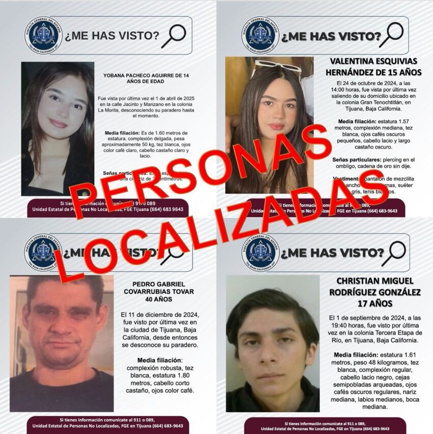 Las personas localizadas son Yobana Pacheco Aguirre de 14 años, Valentina Esquivias Hernández de 15 años, Pedro Gabriel Covarrubias Tovar de 40 años y Christian Miguel Rodríguez González de 17 años de edad.