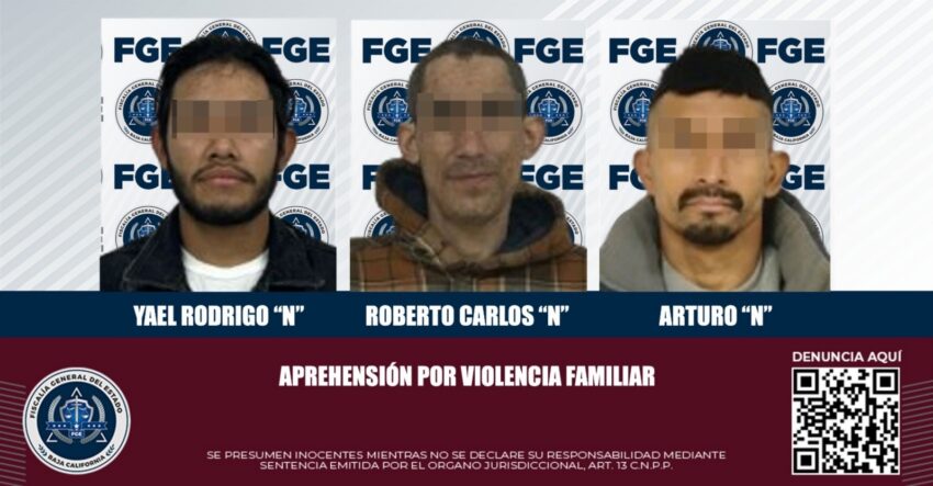 La Fiscalía Regional de Tecate, a través de la Unidad de Investigación de Delitos Contra la Libertad Sexual y la Familia, cumplimentó órdenes de aprehensión contra tres hombres por el delito de violencia familiar, como resultado de los trabajos de investigación y operativos llevados a cabo por la Agencia Estatal de Investigación.